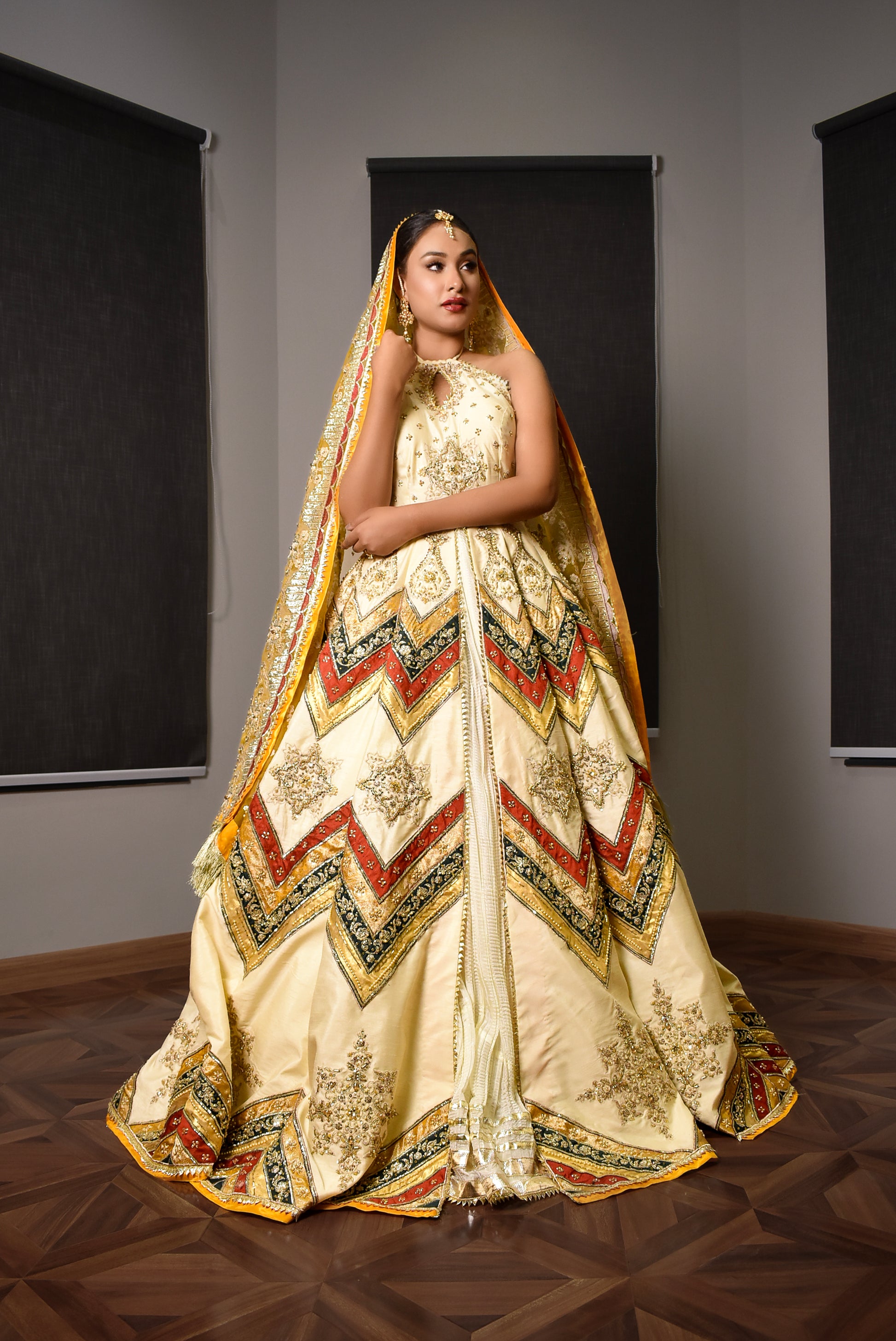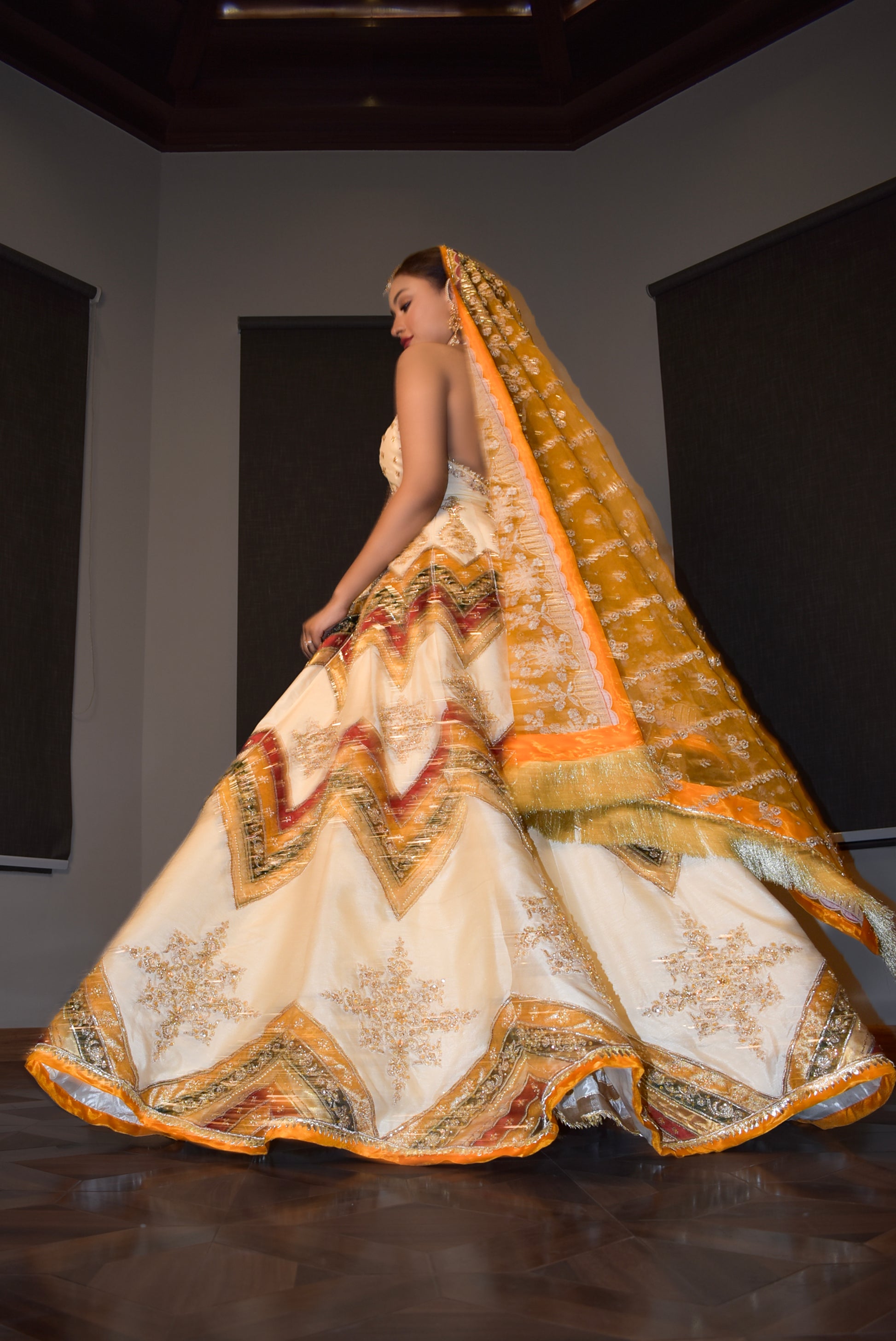 A dainty Beige silhouette, lavishly adorned with intricate embellishments on the front and back bodice, creates an alluring look. The opulent peshwas showcase heavy embellished borders, evoking a regal charm fit for royalty. Accompanying this divine piece is the resplendent Silk Crushed lehnga, draping gracefully and exuding a fairy-tale-like aura. Completing this enchanting ensemble is the handcrafted dupatta, featuring celestial motifs in mesmerizing red hues. Its four-sided embellished border exudes an aura of ethereal elegance.