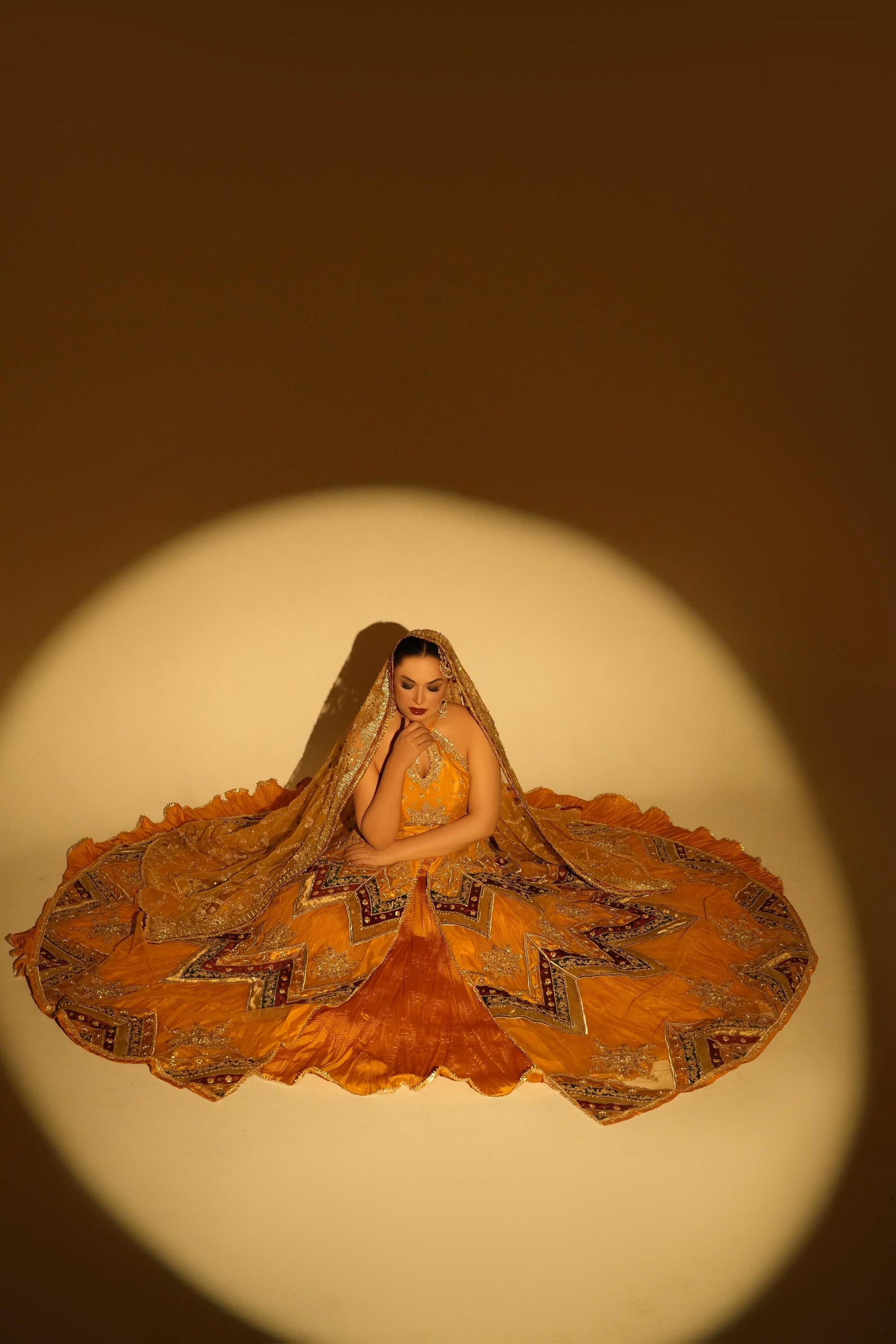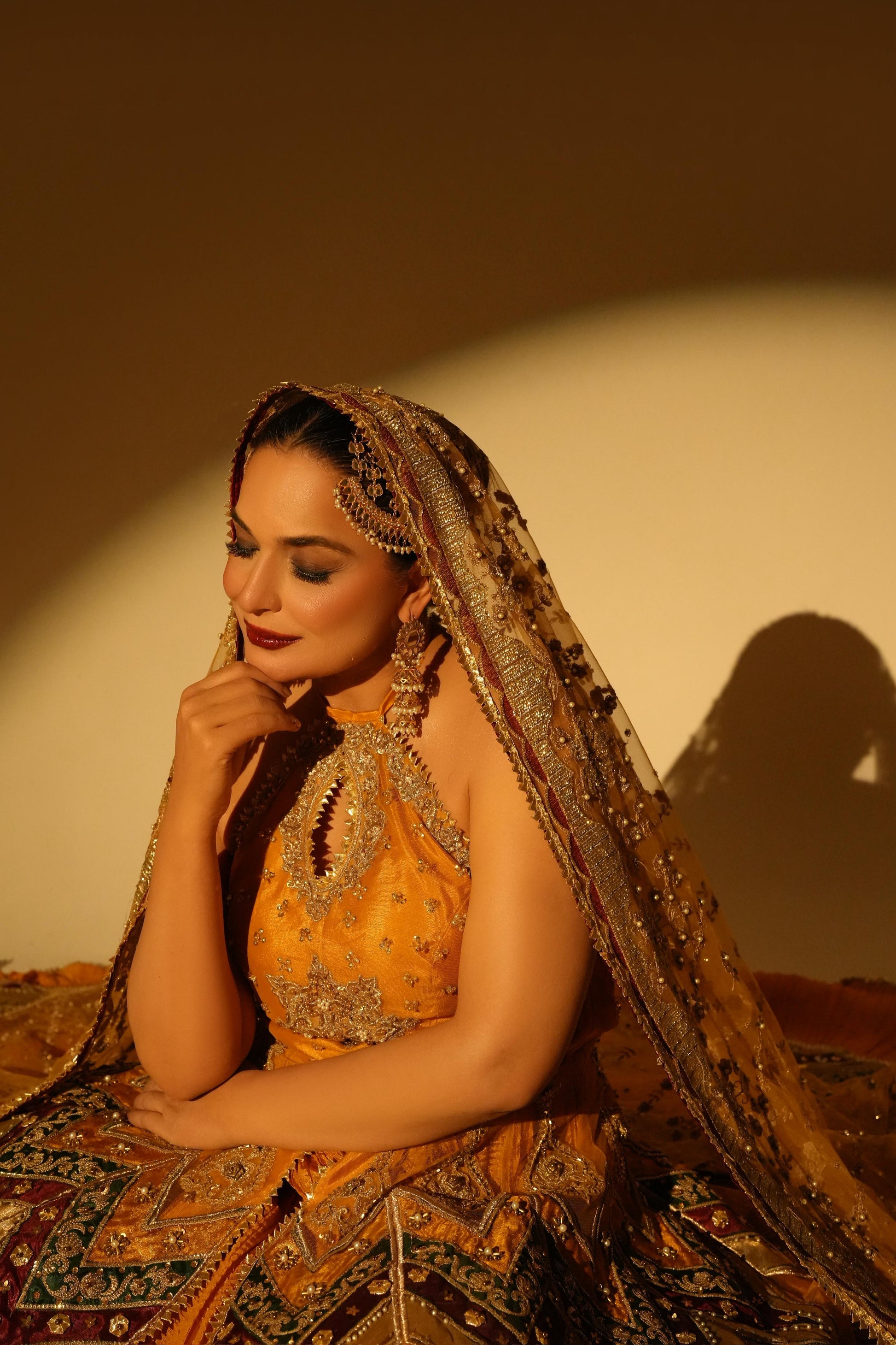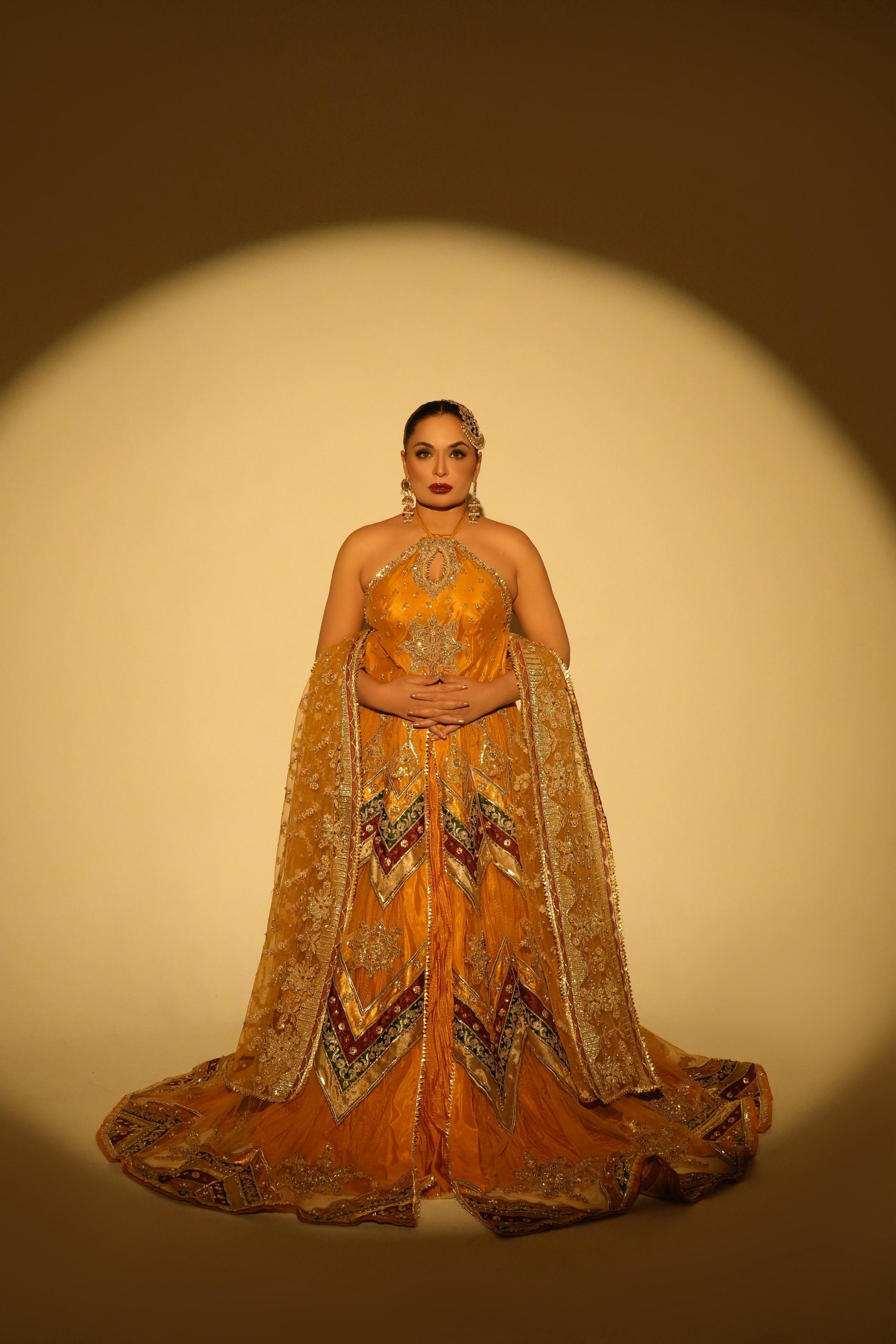 Amaira – Worn by Meera Jee, this striking bridal ensemble exudes festive grandeur. An opulent open gown cascades gracefully over a crushed fabric lehnga, creating layers of movement and drama. Fashioned in a rich mustard hue, the look is a flawless choice for a Mehndi celebration, embodying vibrance, joy, and regal elegance. Designed to make a statement, Amaira celebrates tradition with a modern flair, perfect for the bride who wishes to shine with effortless majesty.