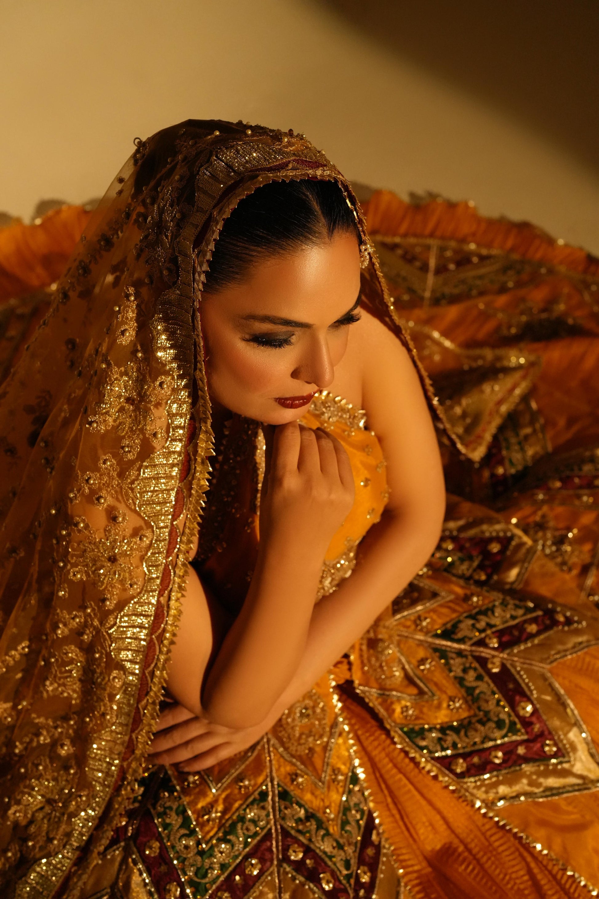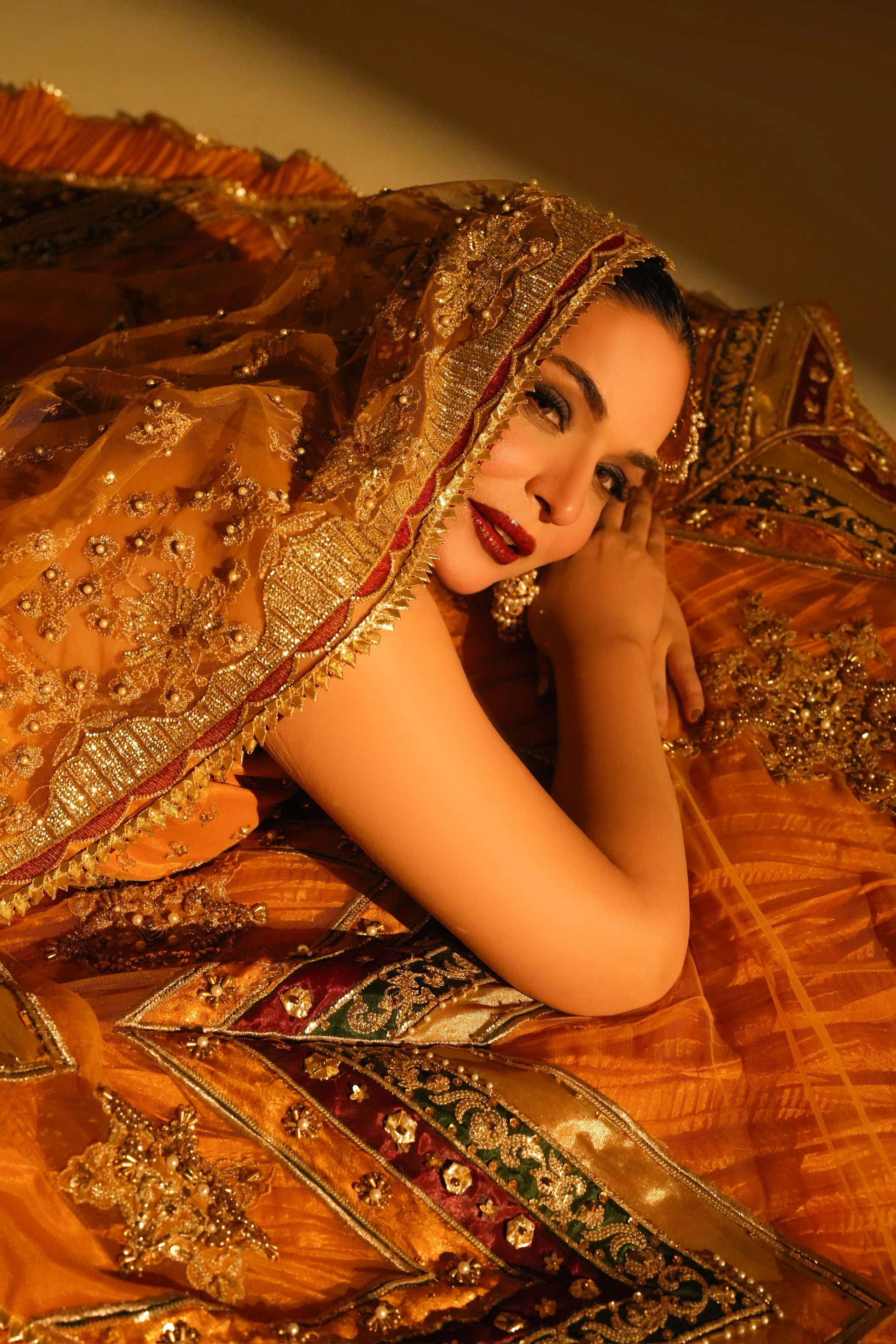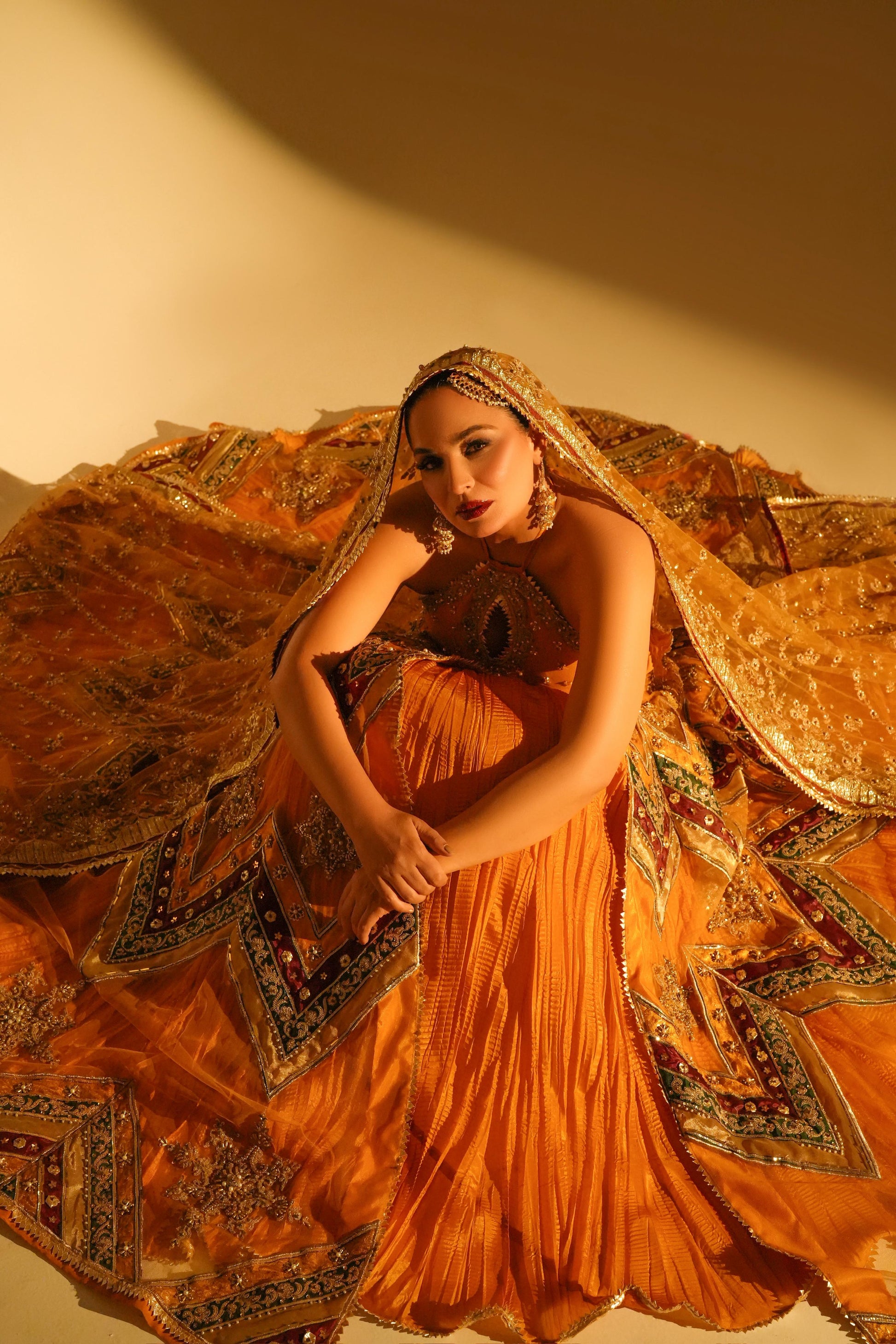 Amaira – Worn by Meera Jee, this striking bridal ensemble exudes festive grandeur. An opulent open gown cascades gracefully over a crushed fabric lehnga, creating layers of movement and drama. Fashioned in a rich mustard hue, the look is a flawless choice for a Mehndi celebration, embodying vibrance, joy, and regal elegance. Designed to make a statement, Amaira celebrates tradition with a modern flair, perfect for the bride who wishes to shine with effortless majesty.