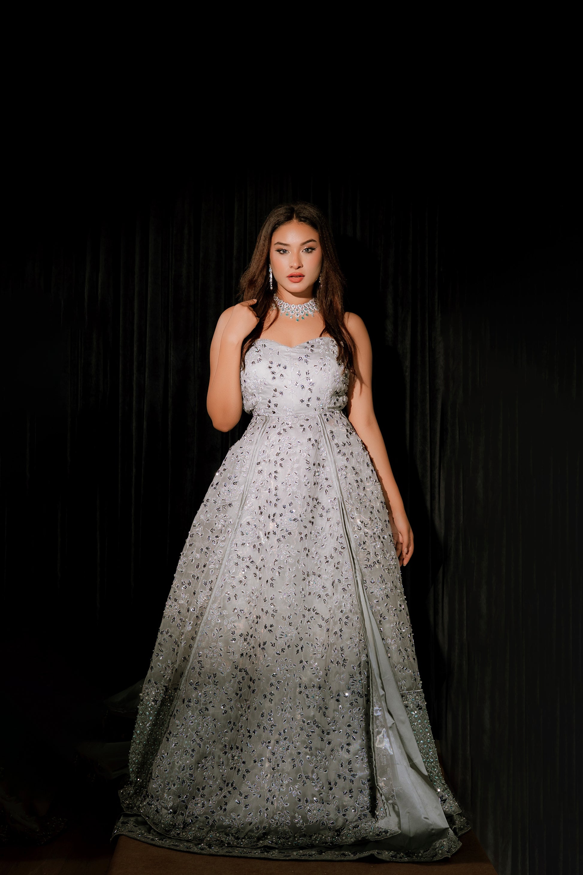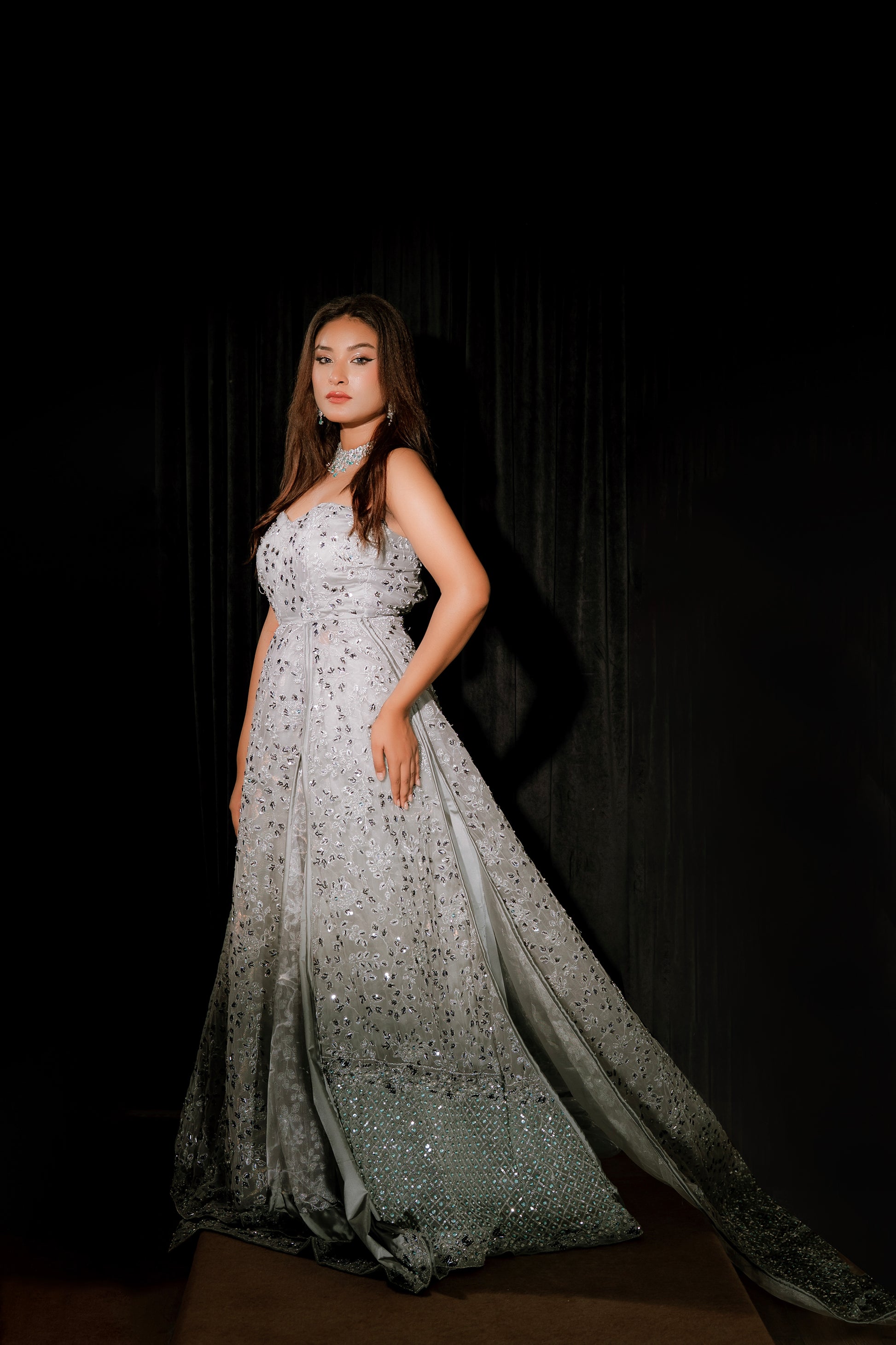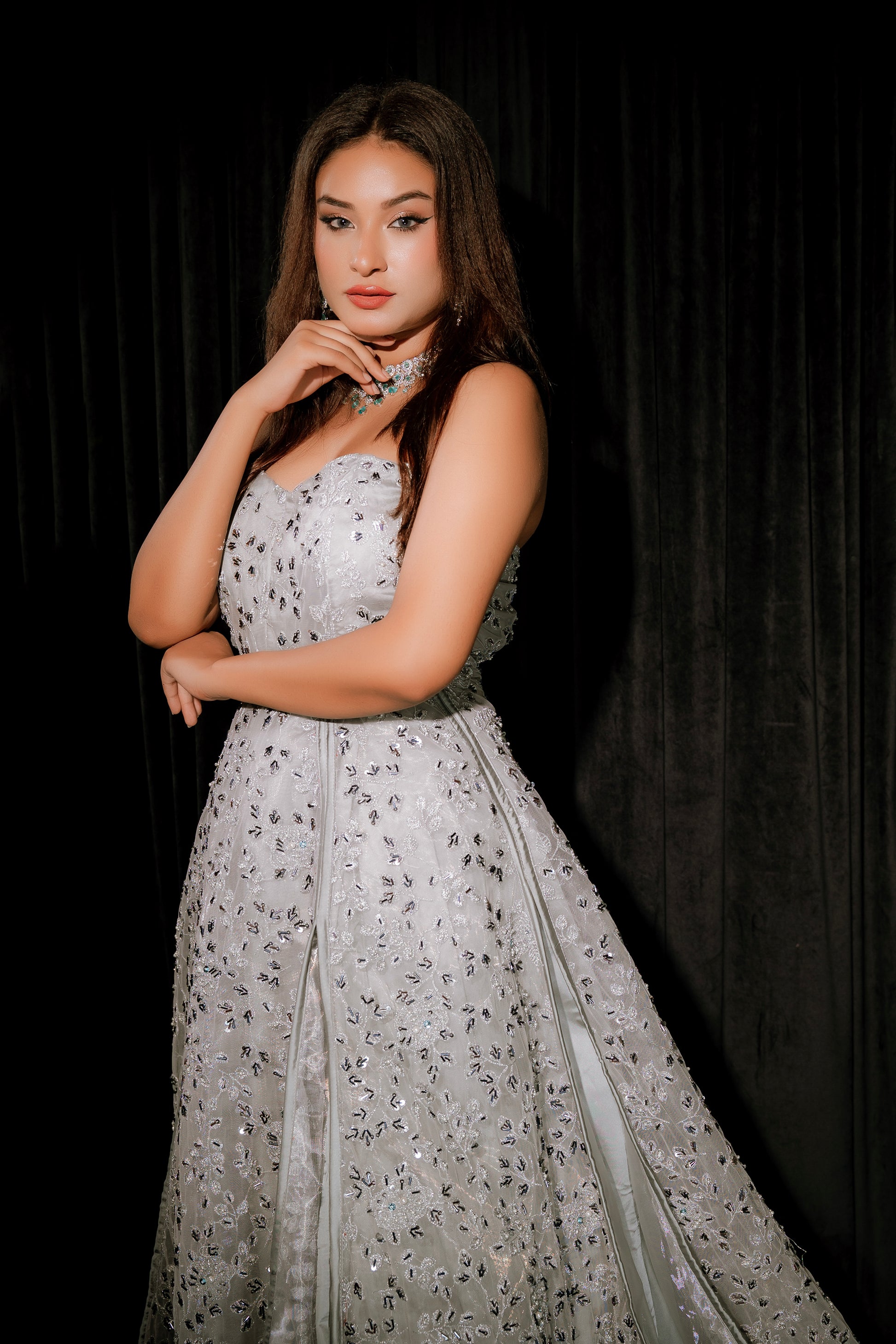 Make a striking entrance in this silver-grey embellished gown, a perfect blend of glamour and grace. Crafted in luxurious net fabric, the gown features a strapless, structured bodice adorned with intricate hand-embellishments, sequins, and reflective detailing that shimmer with every movement.