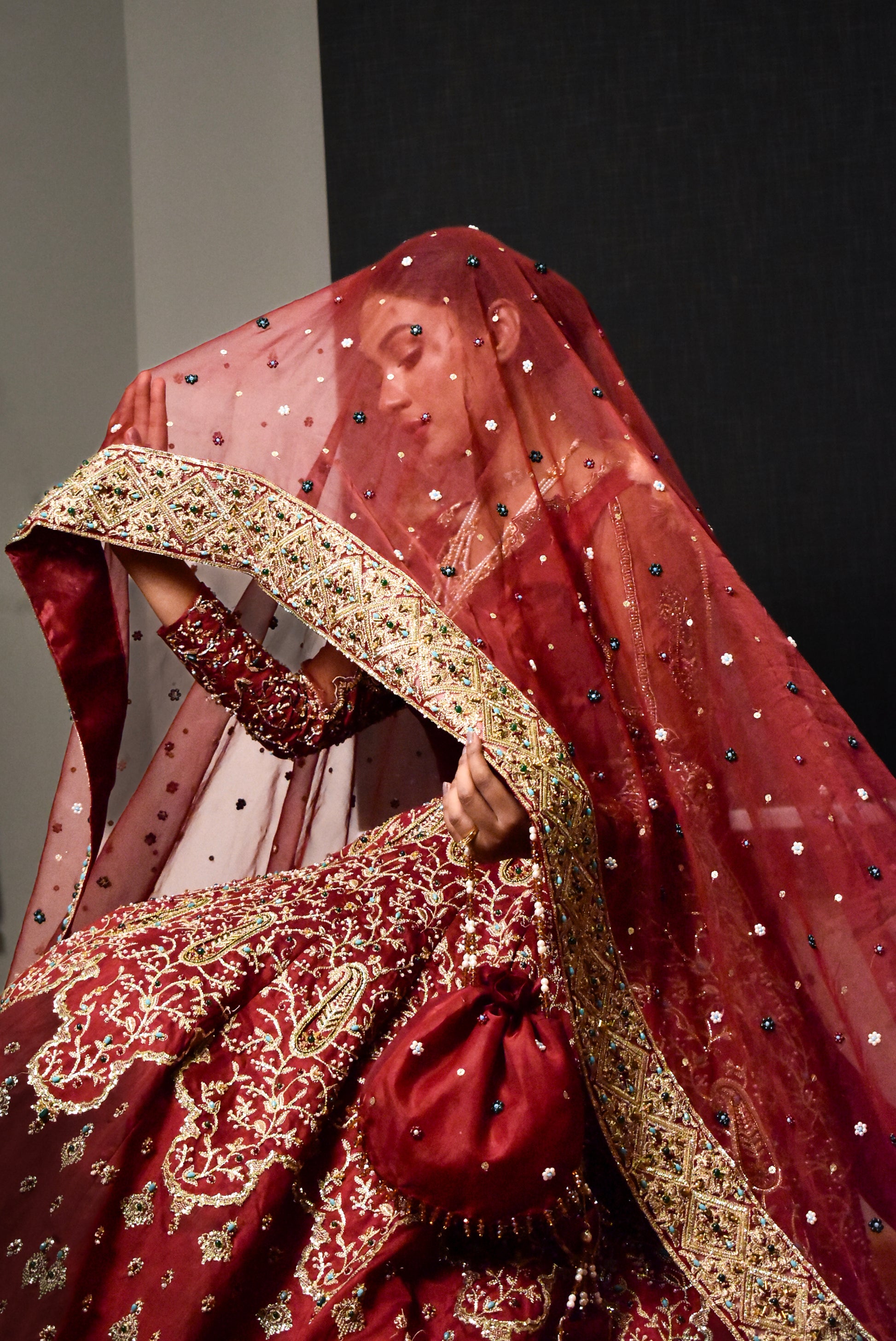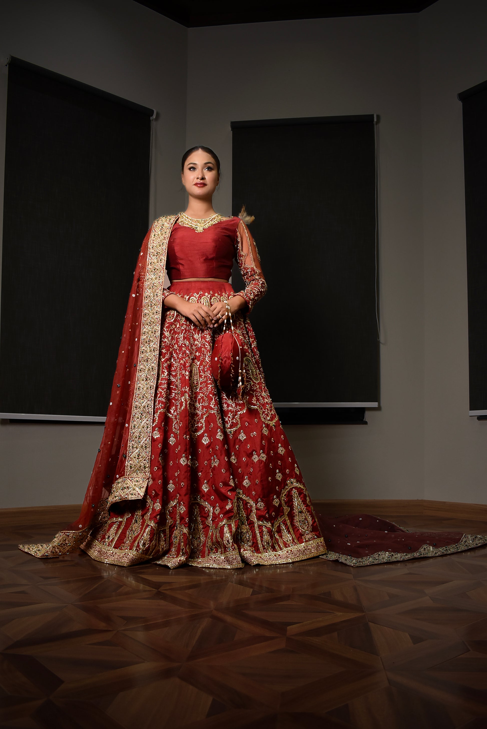 Exuding elegance, this 3-piece vine red ensemble comes with a heavily embellished lehnga with pretty gold adda work. It has been paired with a stunning raw silk blouse with a pretty neckline and illusion net sleeves. To create a perfect bridal showstopper, it comes with a regal organza dupatta intricately embellished with gold adda work on all borders, finished with a contrasting facing and beautiful galaxy throughout.