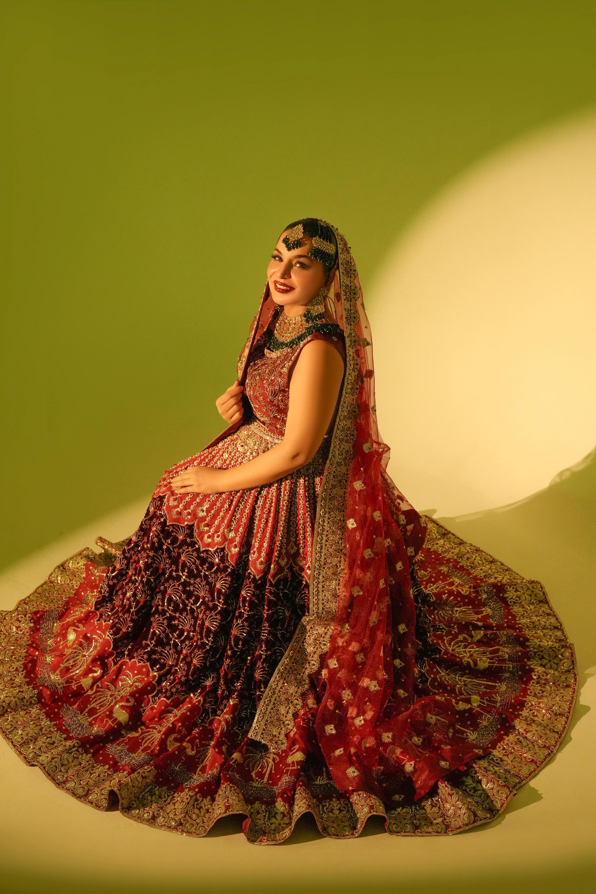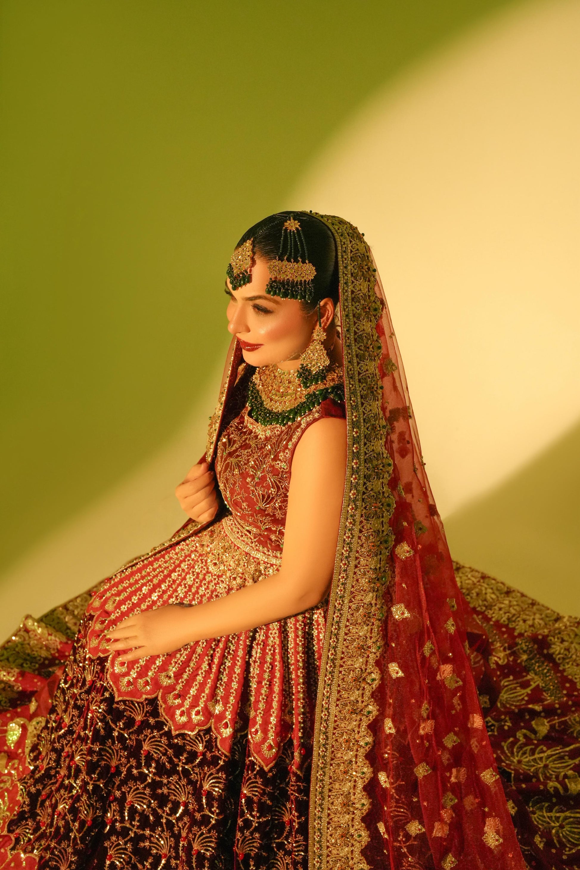 Husna – A regal bridal lengha choli worn by Meera Jee, crafted on a luxurious rawsilk and velvet canvas. The lehnga is adorned with intricate art featuring elegant swans, brought to life through hand embellishments of rubies, emeralds, ferozah and pearls. A masterpiece of grandeur and timeless beauty, designed for the bride who wishes to embody grace and majesty on her wedding day.