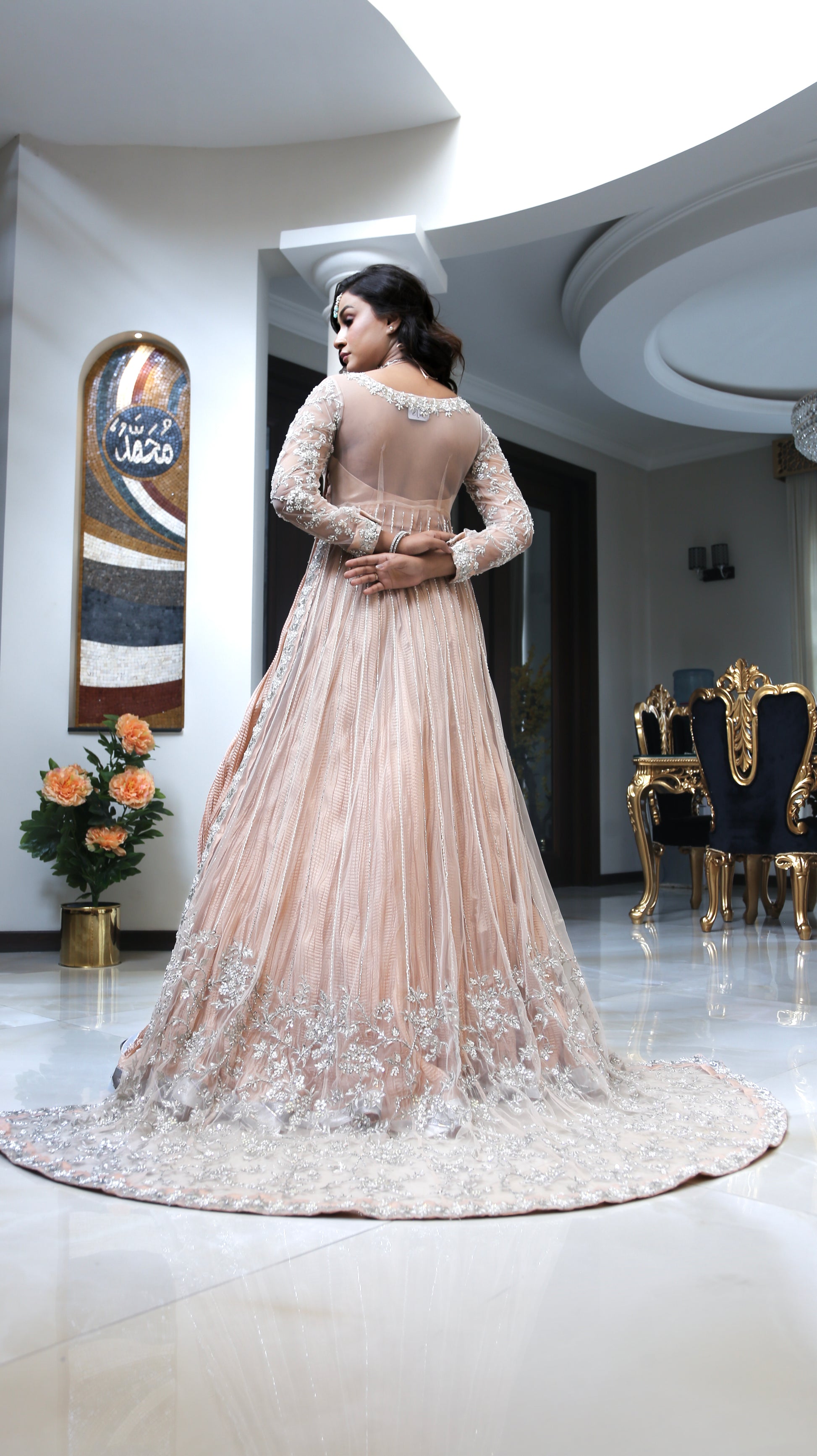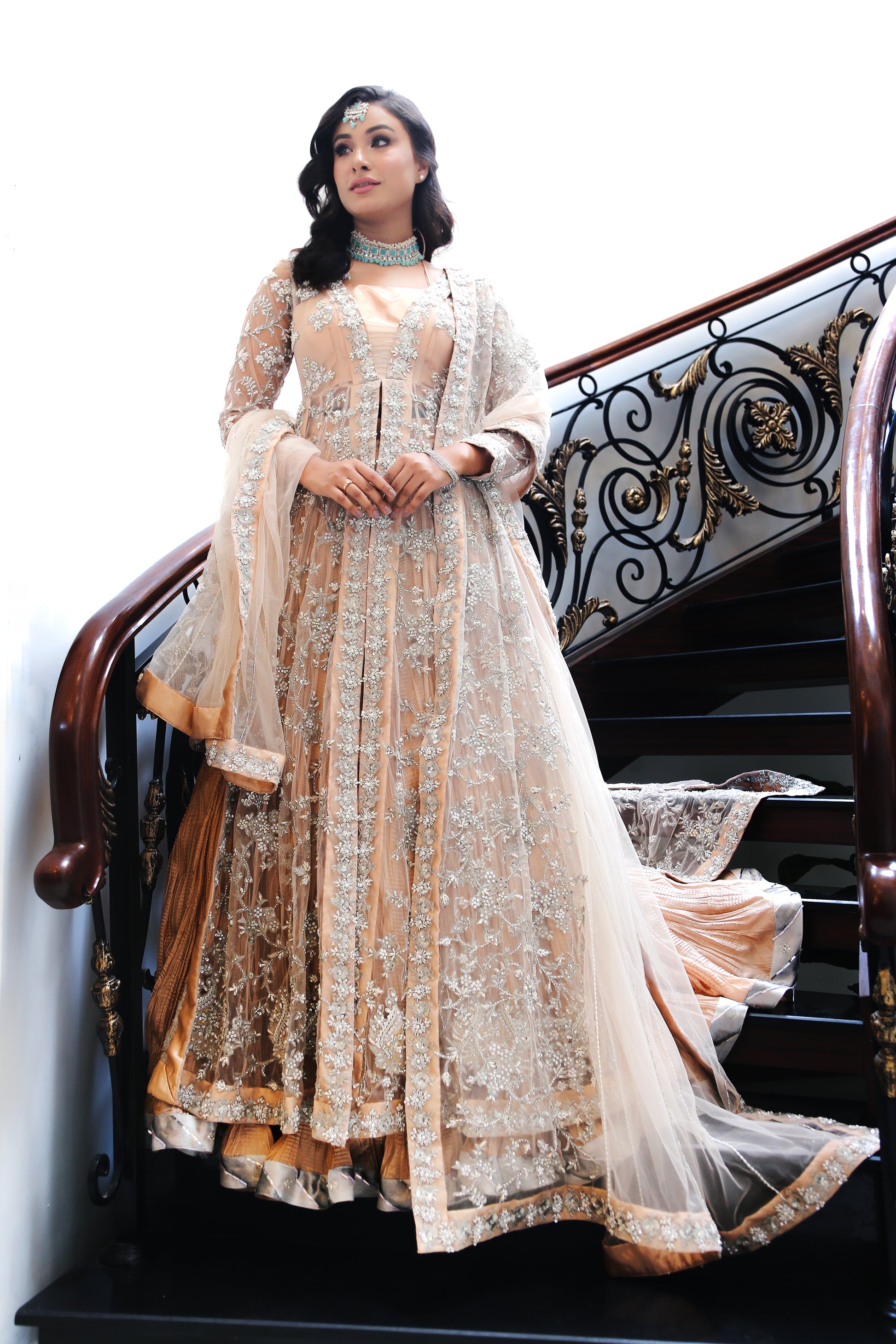 A classic pink net gown crafted with exceptionally intricate embellishment of handwork on the body, sleeves, and in panels, pairing with a crushed lehnga with chatapati border finishing. To complete the grandeur look, it comes with a net dupatta with heavily embellished borders on all four sides.