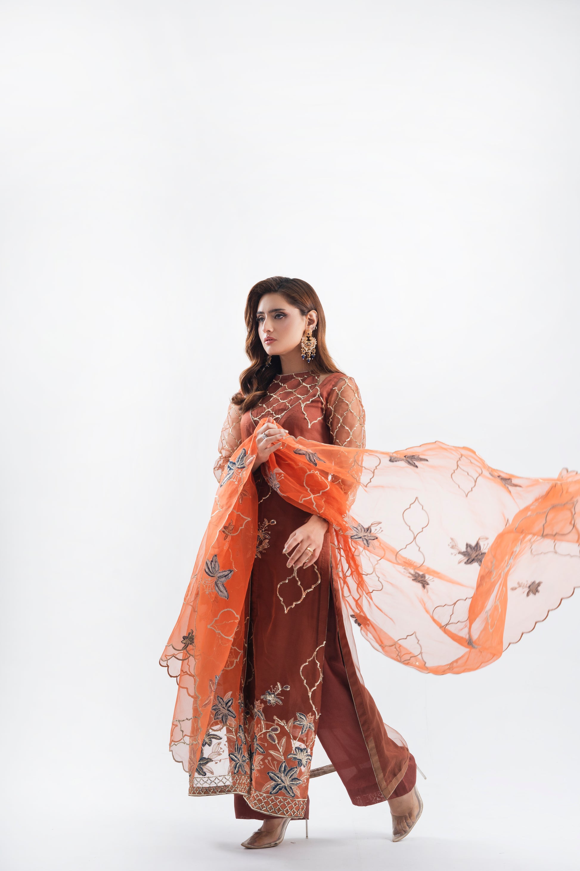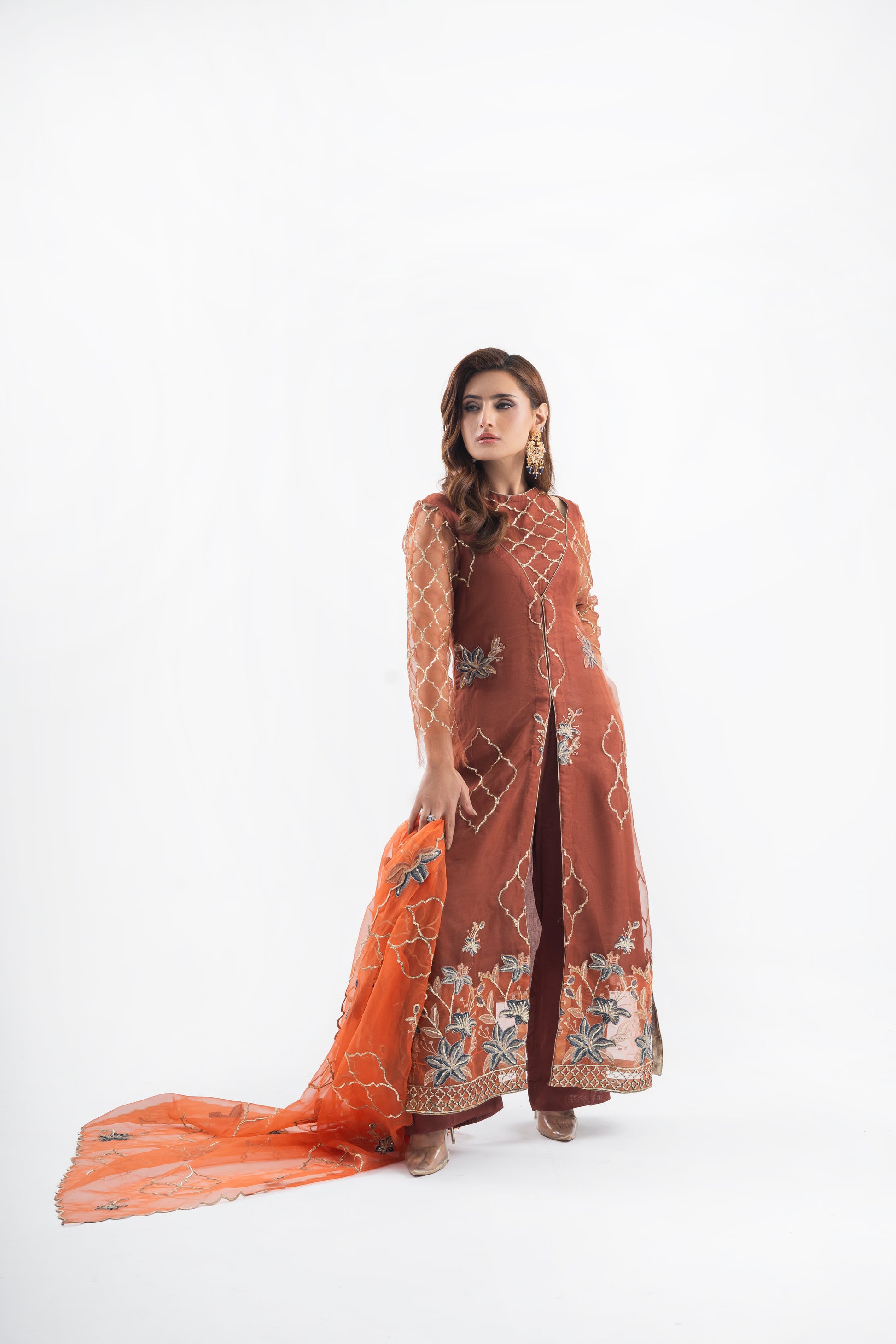 Organza Embroidered front 0.75 yard Organza Embroidered front border 0.75 yardOrganza Embroidered Sleeve 0.75 yard Organza Embroidered Doubata 2.75 yardOrganza for back 0.75 yardDyed Grip trouser 2.5 yardDyed cotton silk 2.5 yard