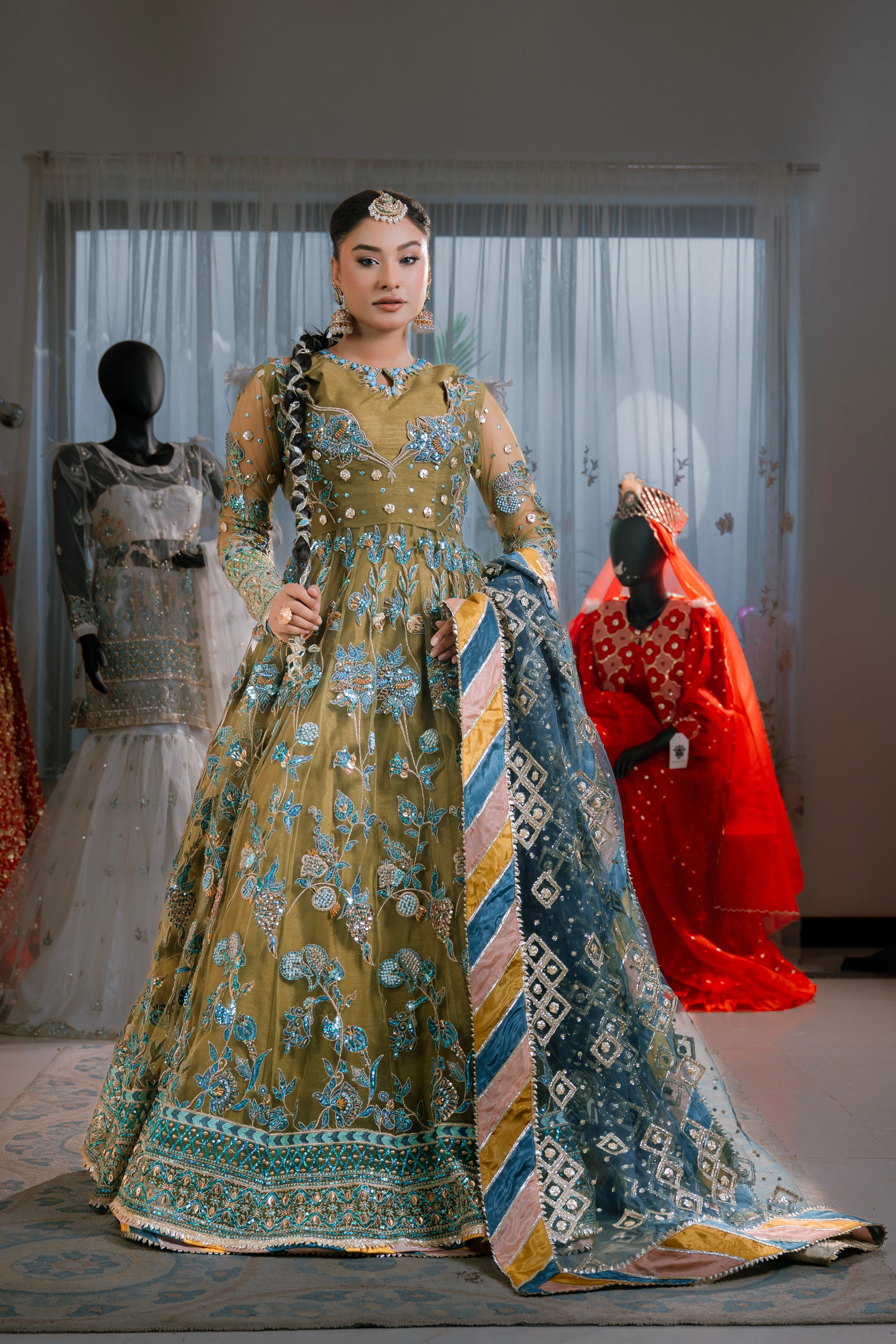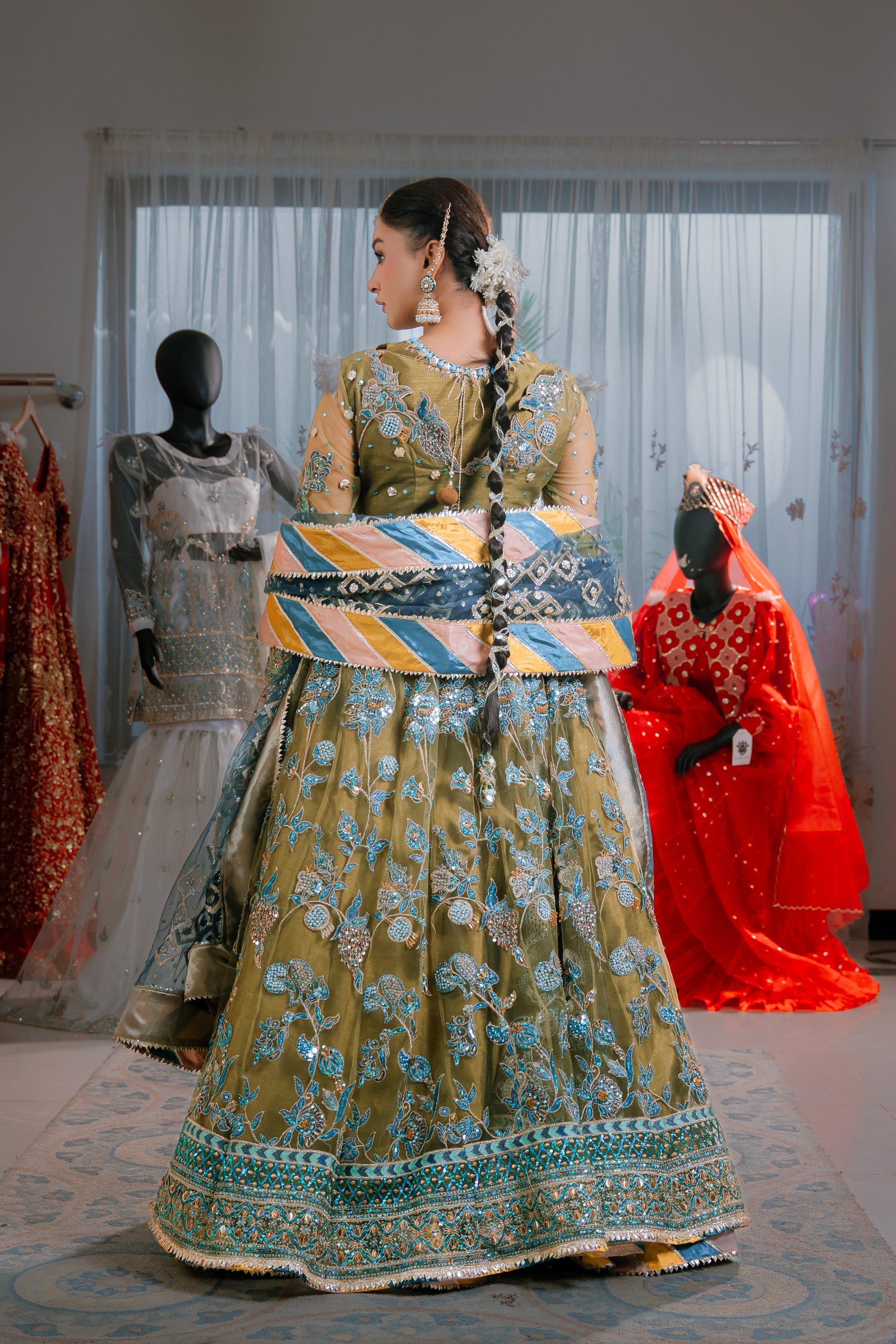 The look is completed with a delicate dupatta adorned with intricate Chata Pati work on all four sides, adding vibrant detail and a touch of heritage craftsmanship. The harmonious blend of colors and textures makes "Mahaguri" a standout piece that exudes sophistication and cultural grace.