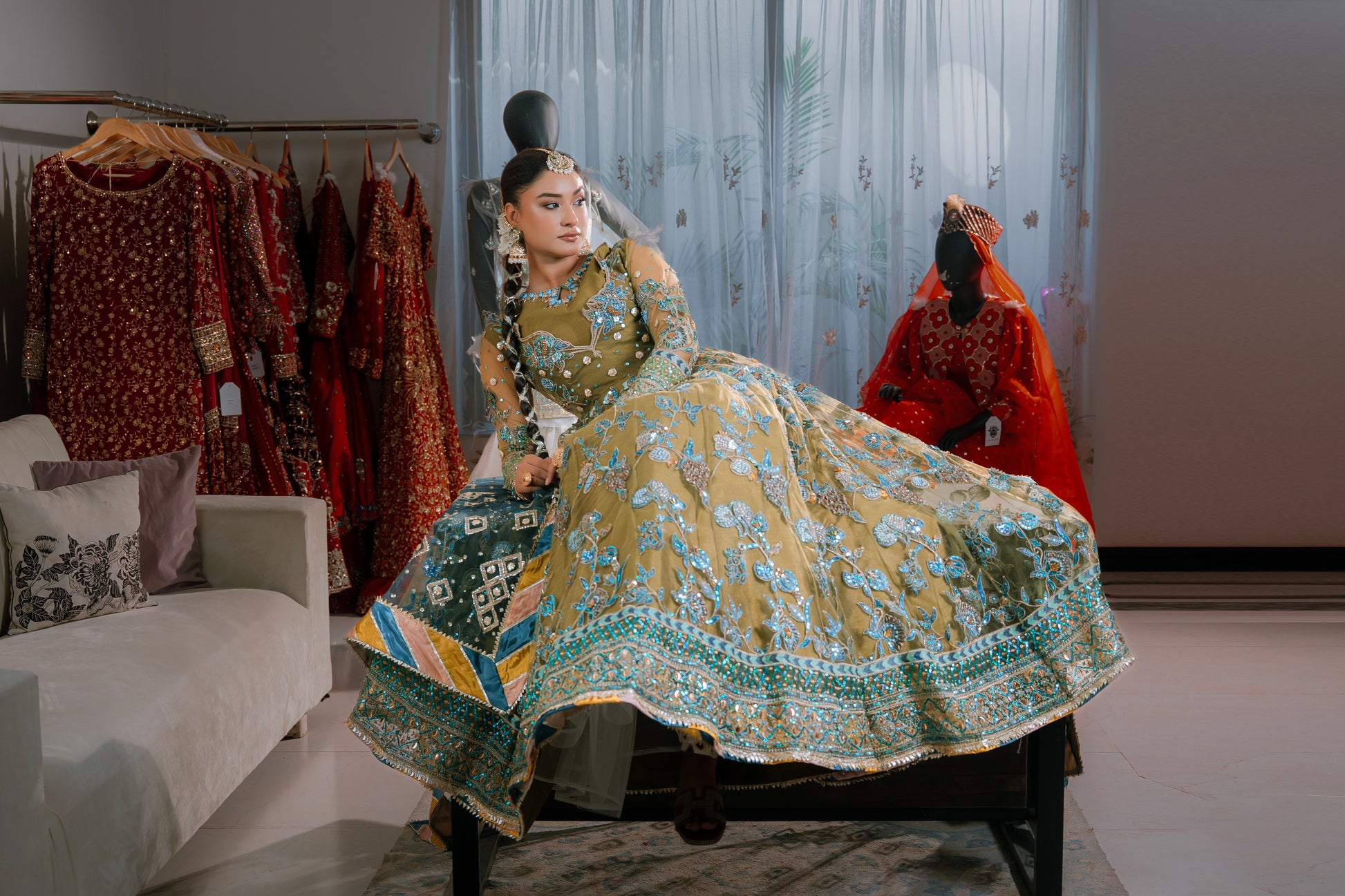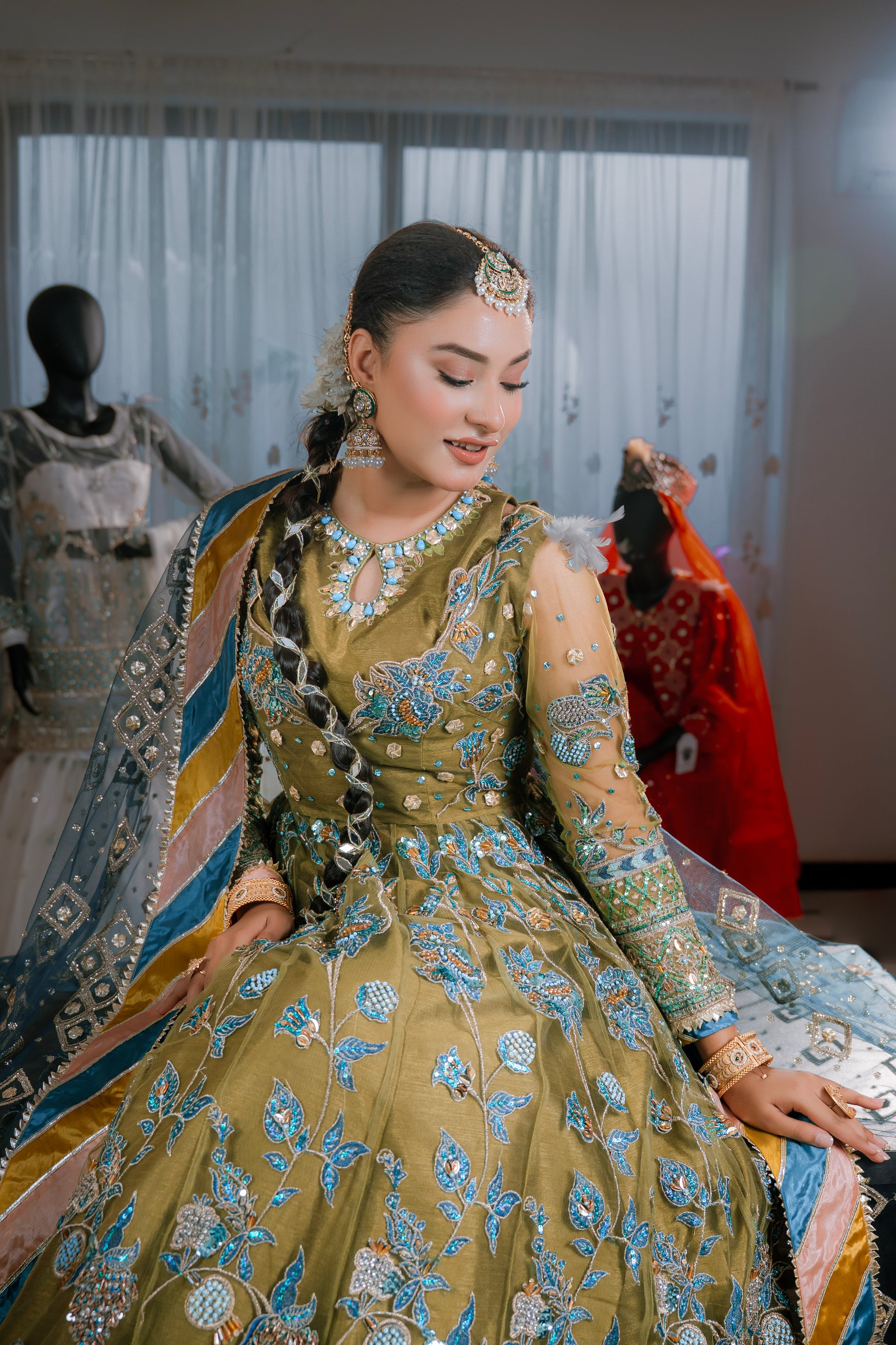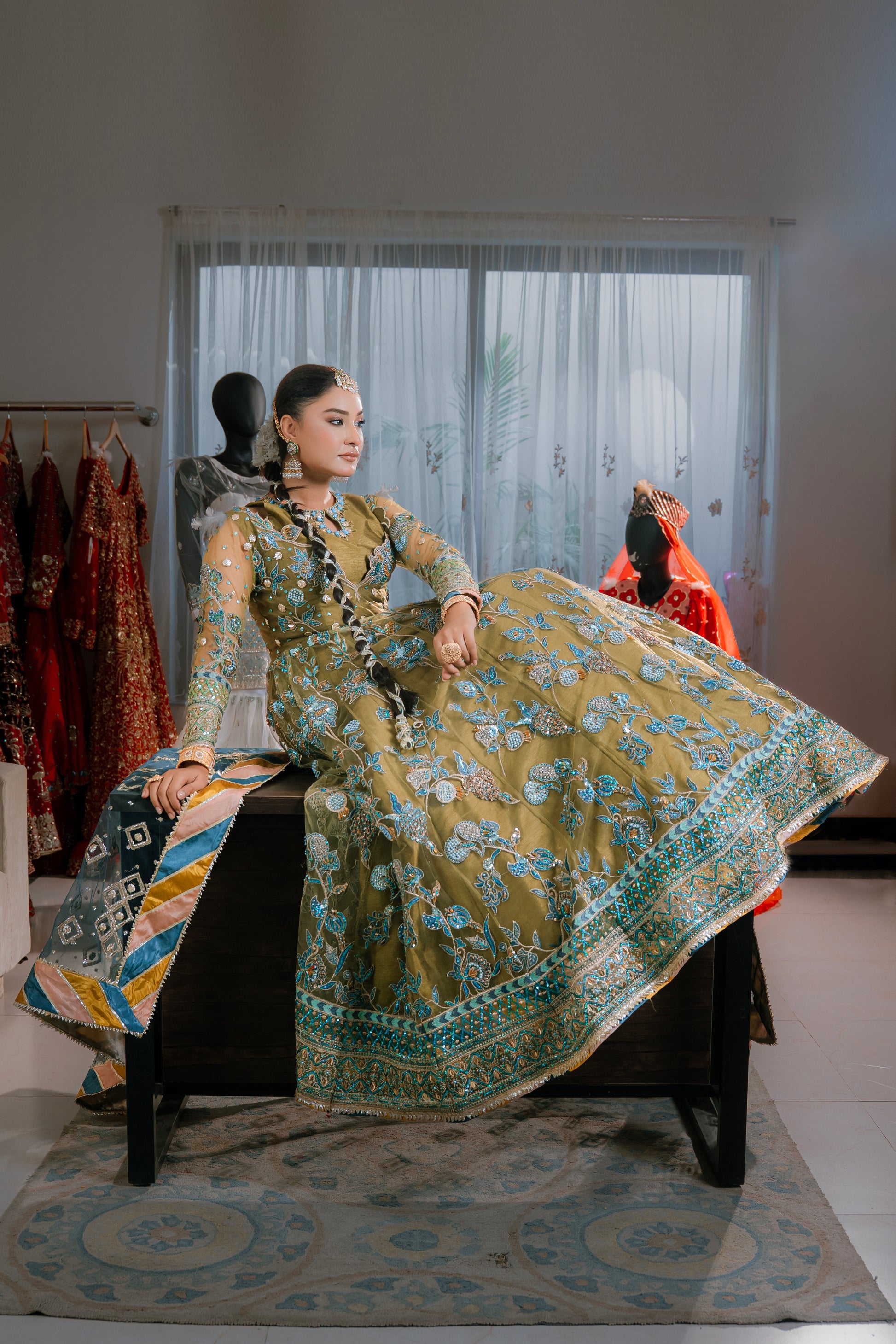 Elevate your traditional wardrobe with our stunning "Mahaguri" ensemble — a graceful fusion of elegance and timeless charm. This outfit features a beautifully crafted gown paired with a lehenga, creating a rich and regal silhouette perfect for weddings, festive events, or formal occasions.