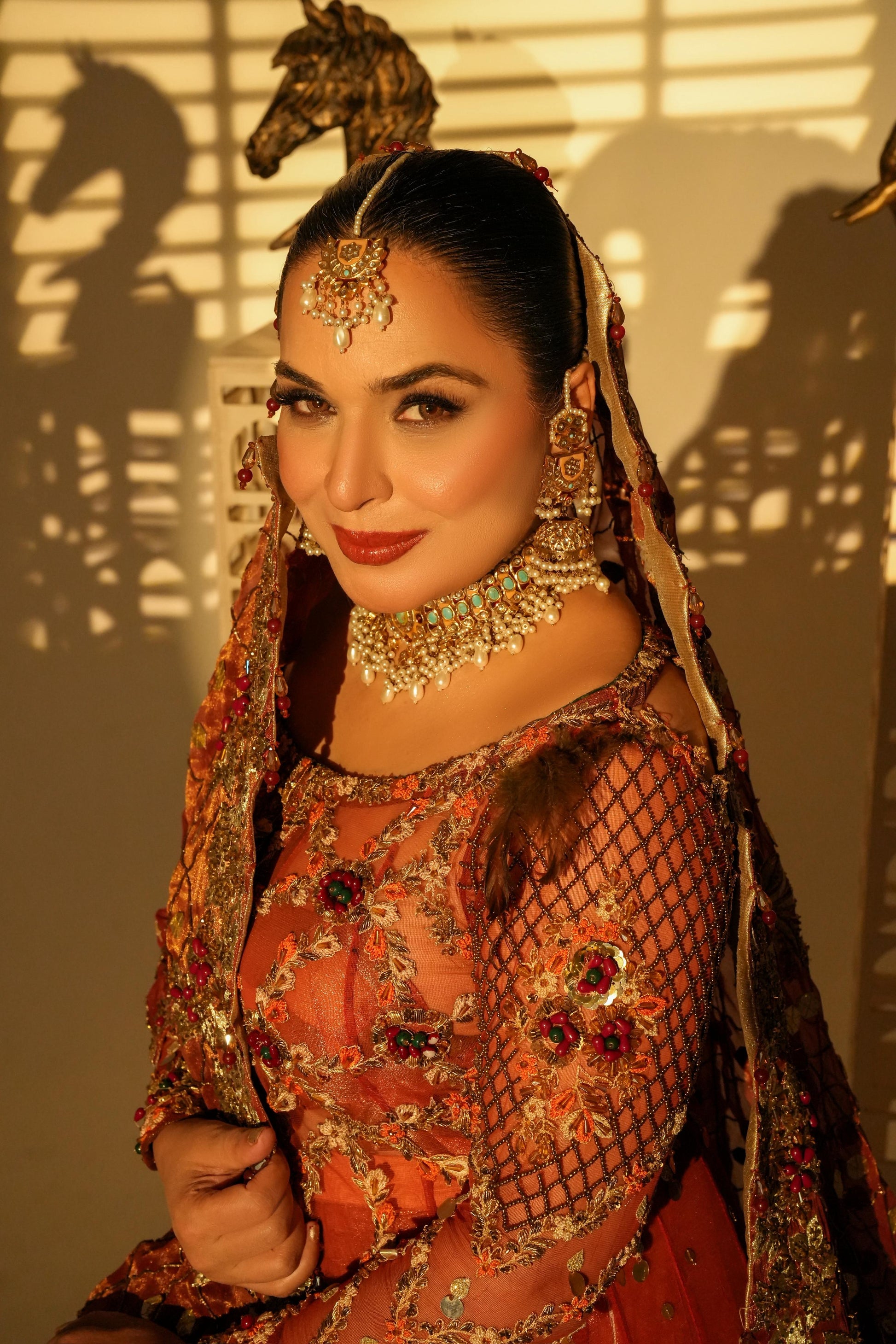Meera – Our crown jewel, designed and crafted exclusively for Meera Jee. This hand-crafted farshi shirt and grand tail lehnga is drenched in the finest embellishments, each detail meticulously placed to radiate opulence. Paired with a heavily adorned Missouri-based dupatta, it stands as the epitome of bridal luxury. Meera is not just a dress – it is an heirloom of artistry, magnificence, and timeless grandeur.