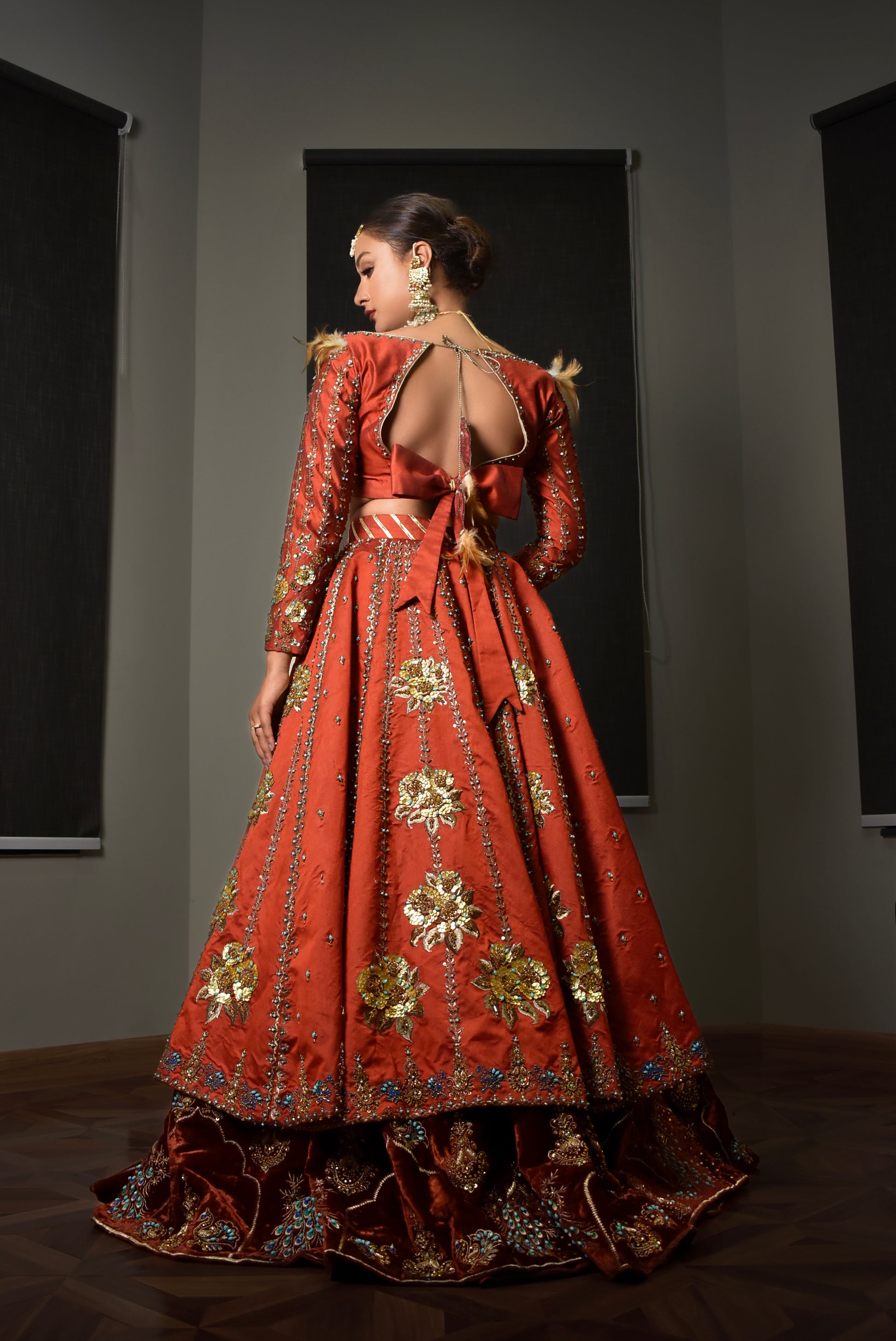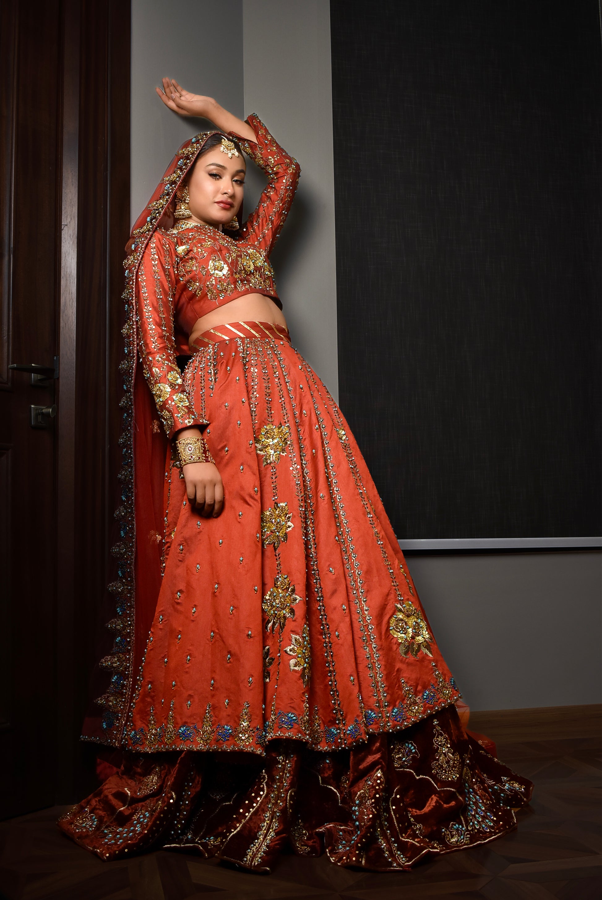 Exuding elegance, this 3-piece Sindhouri red ensemble comes with a heavily embellished double-layered lehnga with pretty copper adda work. It has been paired with a stunning raw silk blouse with a pretty neckline and heavy sleeves. To create a perfect bridal showstopper, it comes with a regal organza dupatta intricately embellished with copper adda work on all borders finished with a contrasting facing and beautiful botiyan throughout.