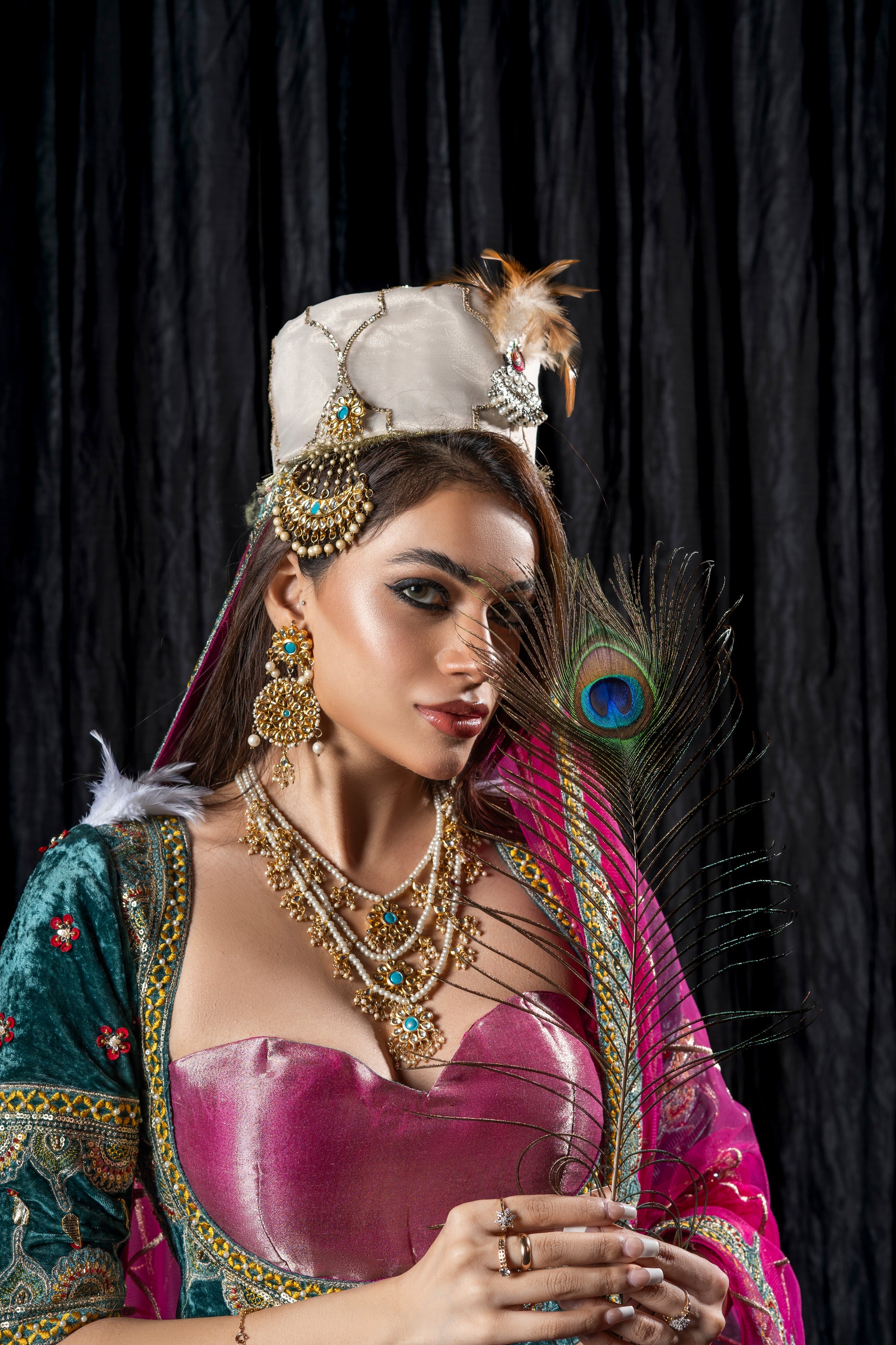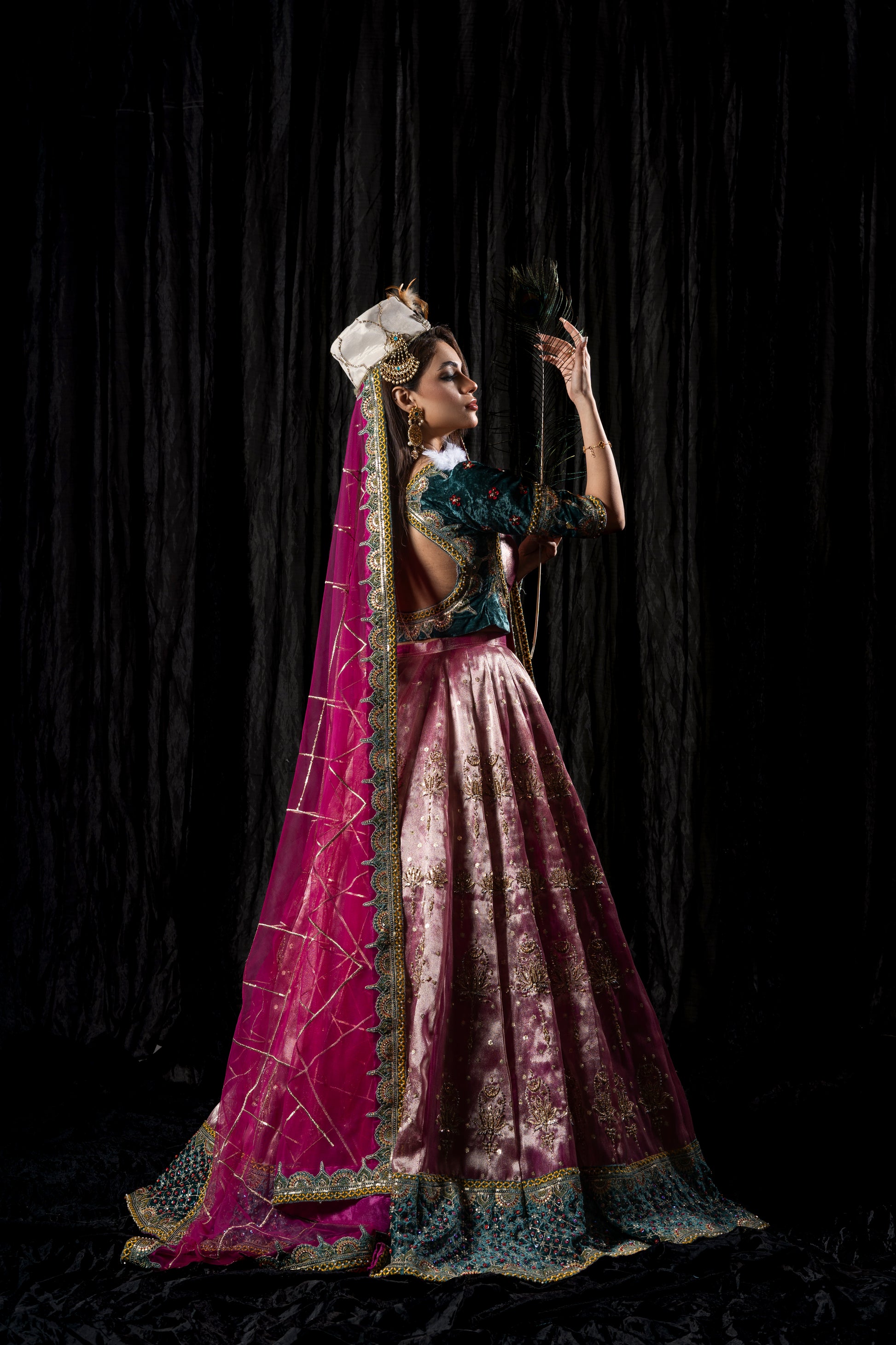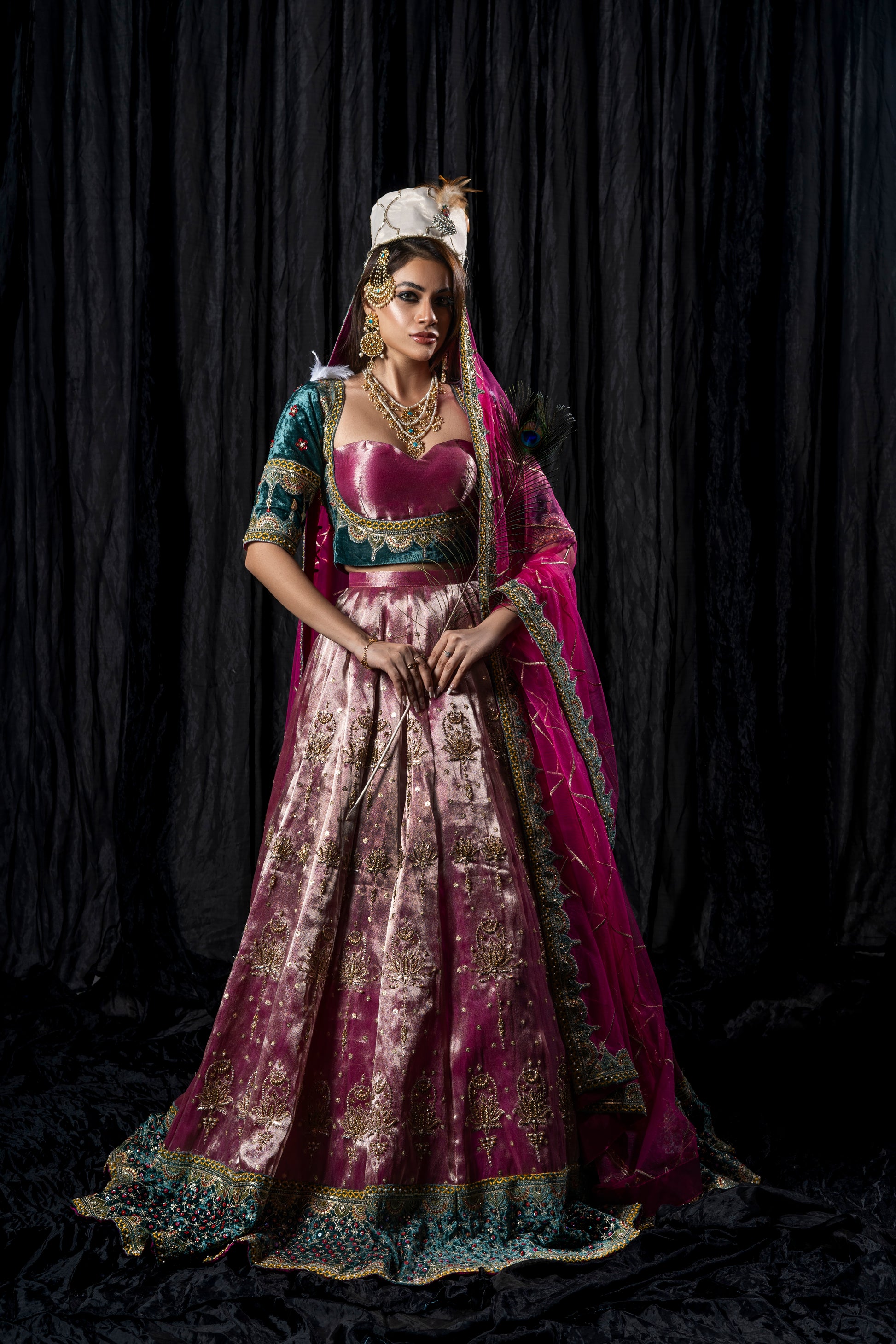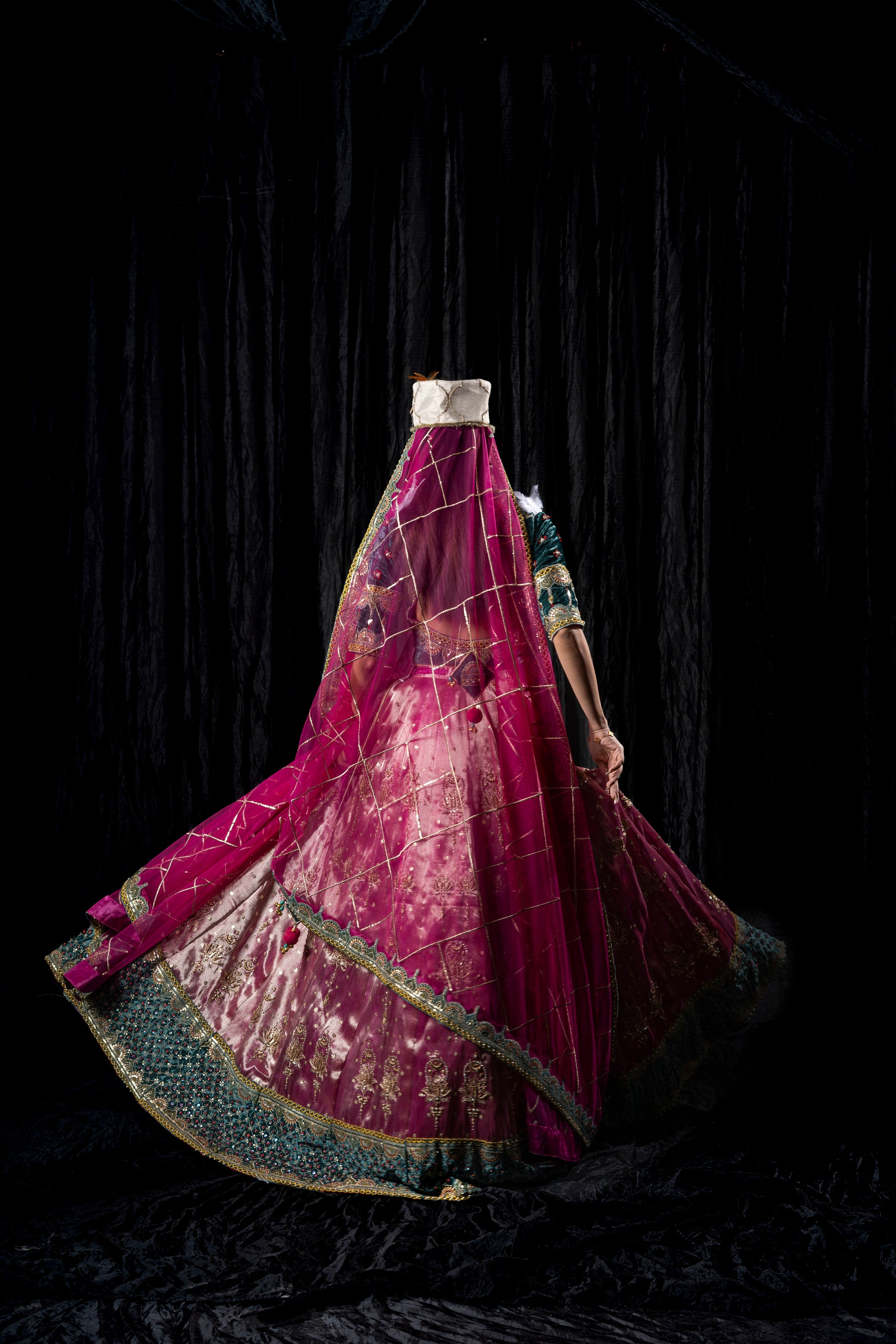 Exuding elegance, this 3-piece shocking pink ensemble comes with a heavily embellished lehnga with pretty gold adda work. It has been paired with a stunning Madhu bhala velvet blouse with a pretty neckline, to create a perfect bridal showstopper, it comes with a regal net dupatta intricately embellished with gold adda work on all borders, finished with a contrasting facing and beautiful geometrical art throughout.