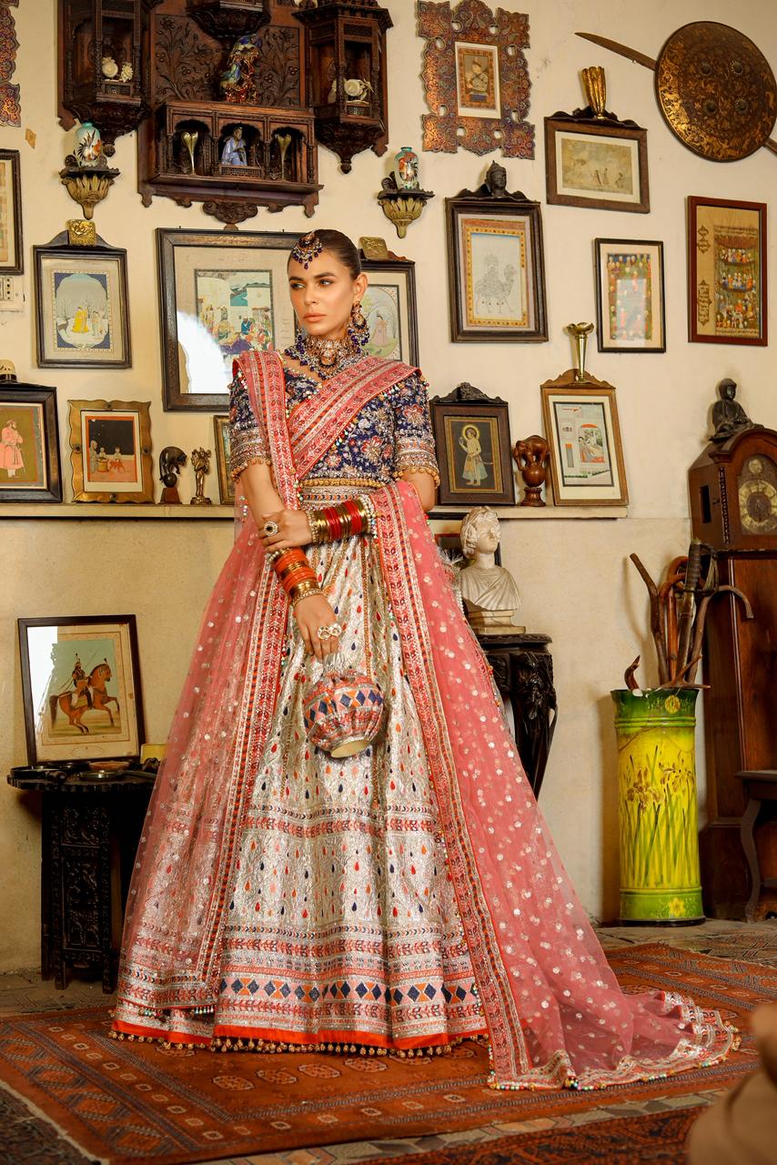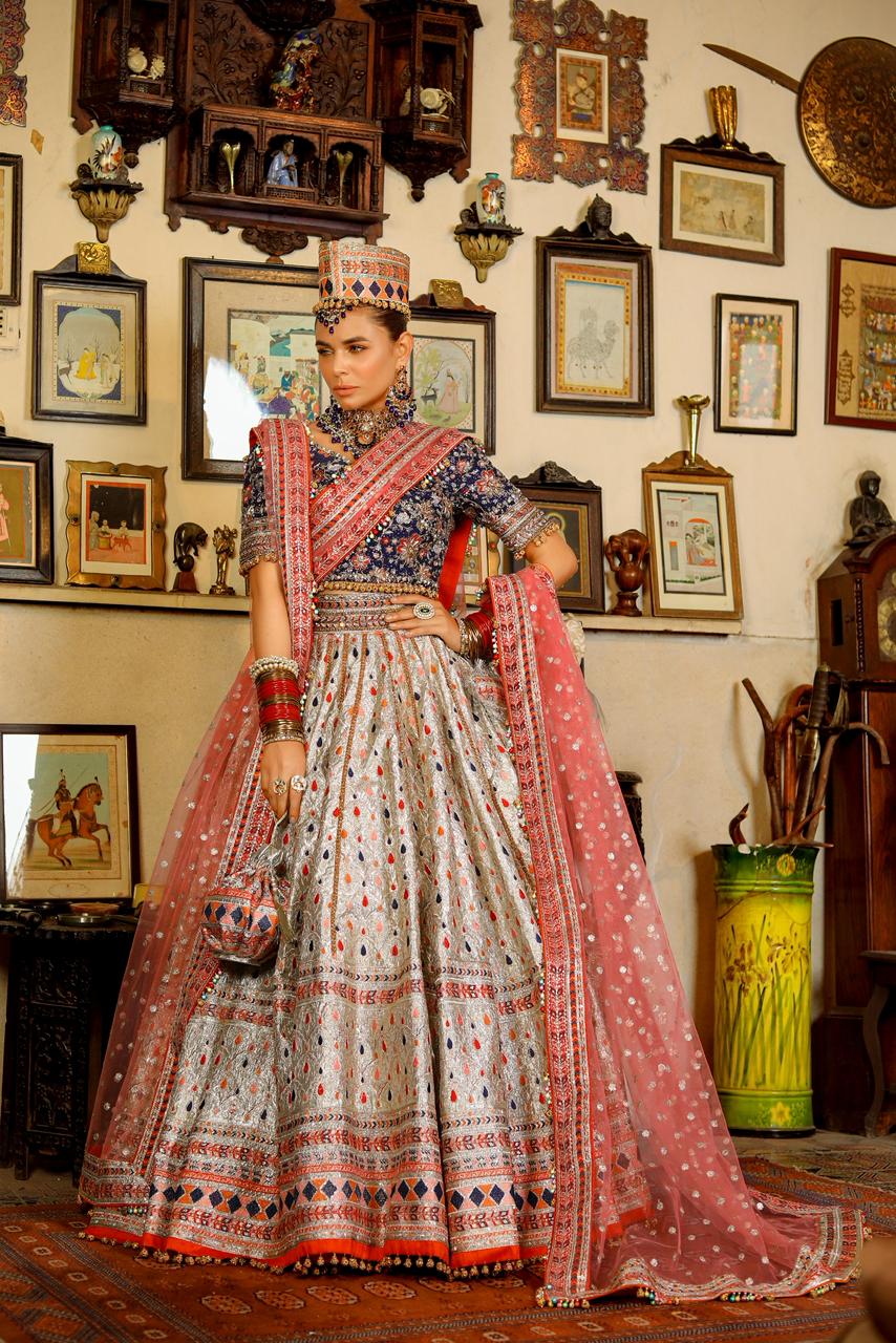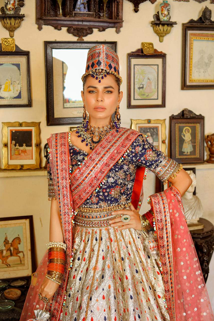 A 5 pcs bridal rangoon is a stunning royal blue blouse drenched in a multi hand embroidery adorned with crystal, kora dabka,pearls and bethki. Its paired with a beautiful tissue lehanga with multi embroidery with the embellished lines in the pannels. It comes along with two net pink dupattas ,border along the four sides and hangings of multi ghungru and matellic balls with potli is completing the look for your festive season.