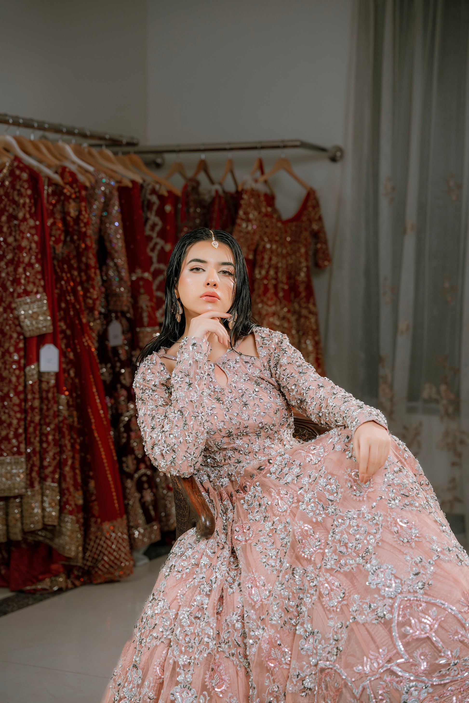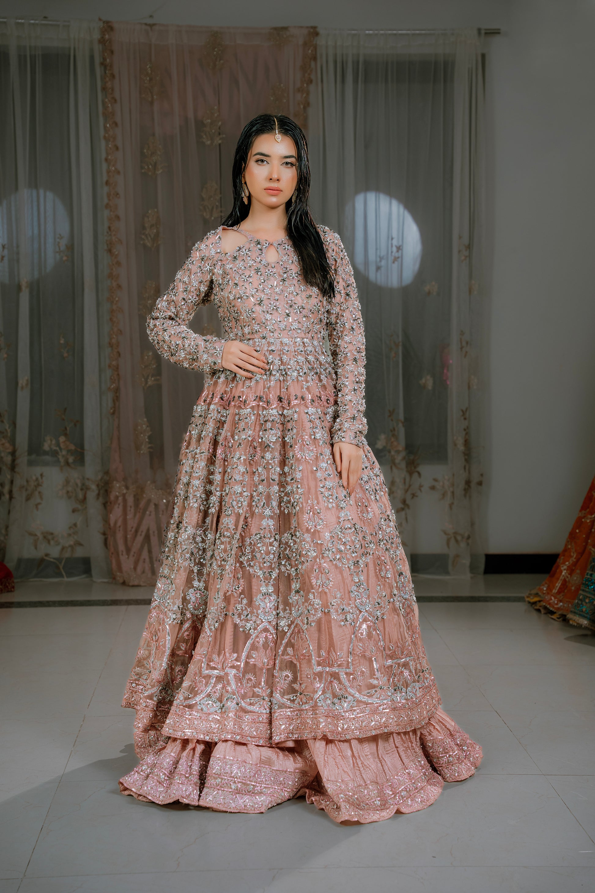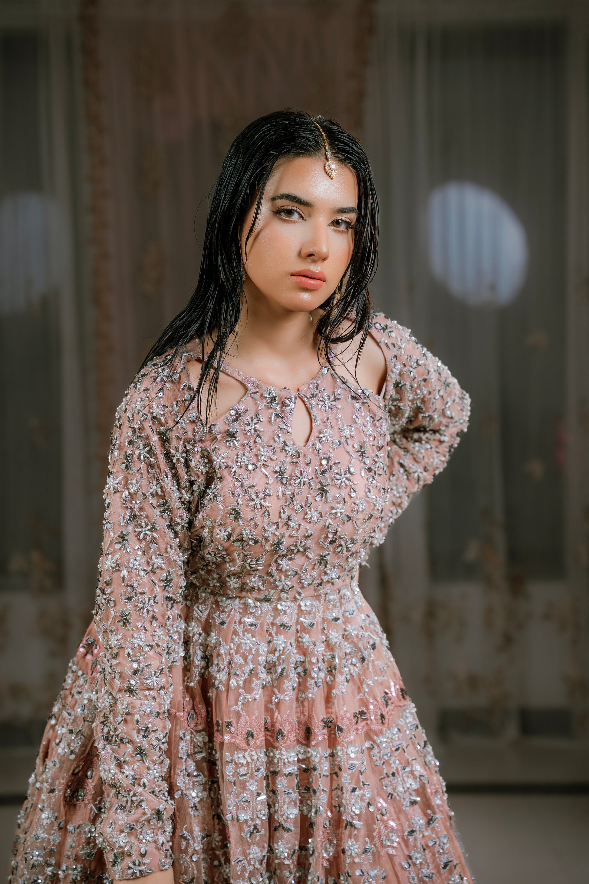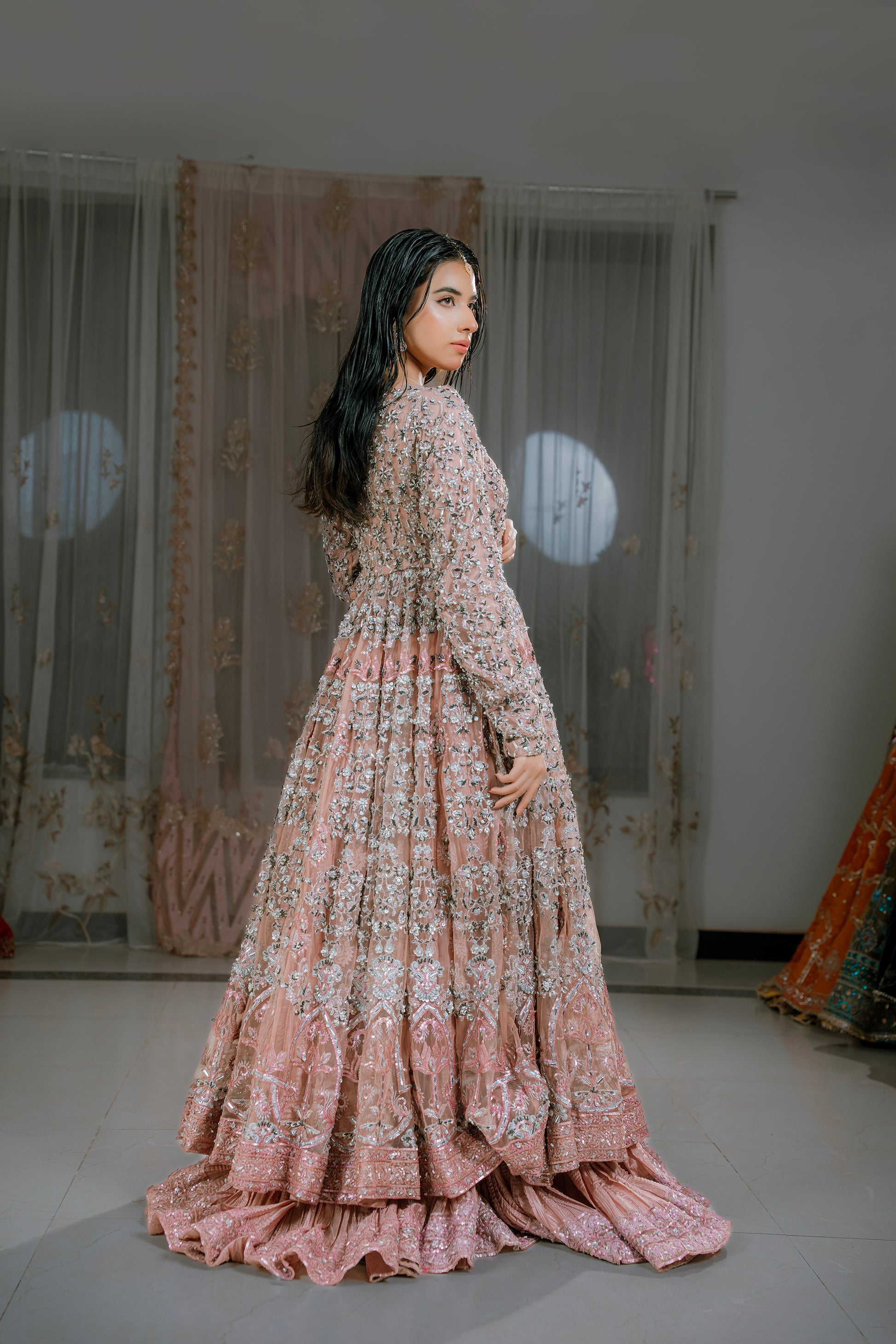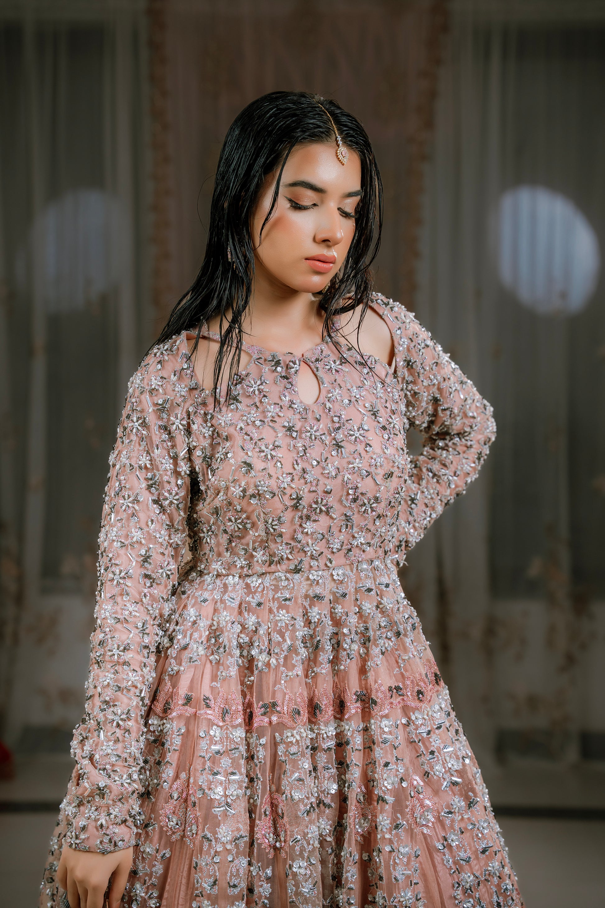 Step into timeless elegance with this stunning Mauve flared gown crafted from delicate net fabric. The gown features a heavily handcrafted bodice, intricately adorned with fine embroidery and embellishments that bring a luxurious, artisanal touch to the ensemble.