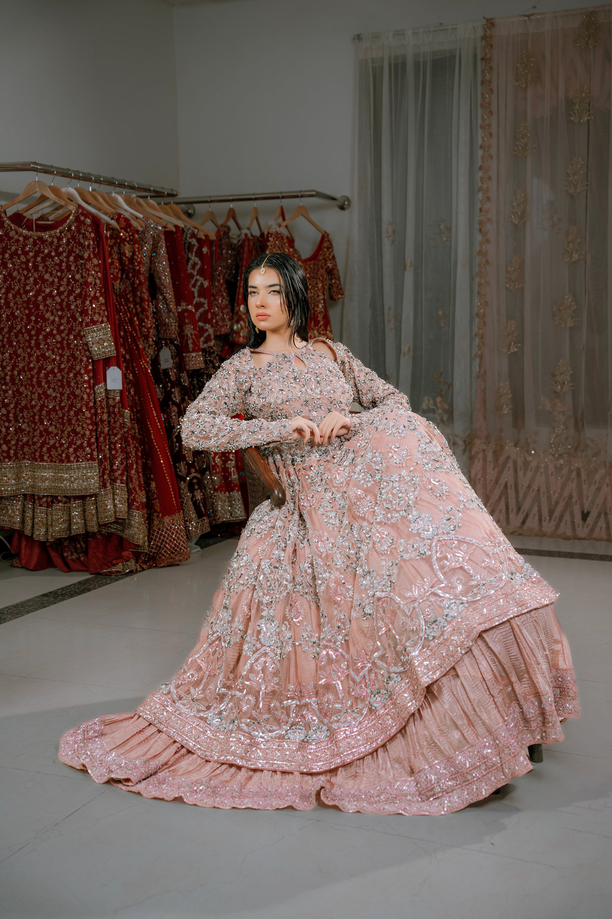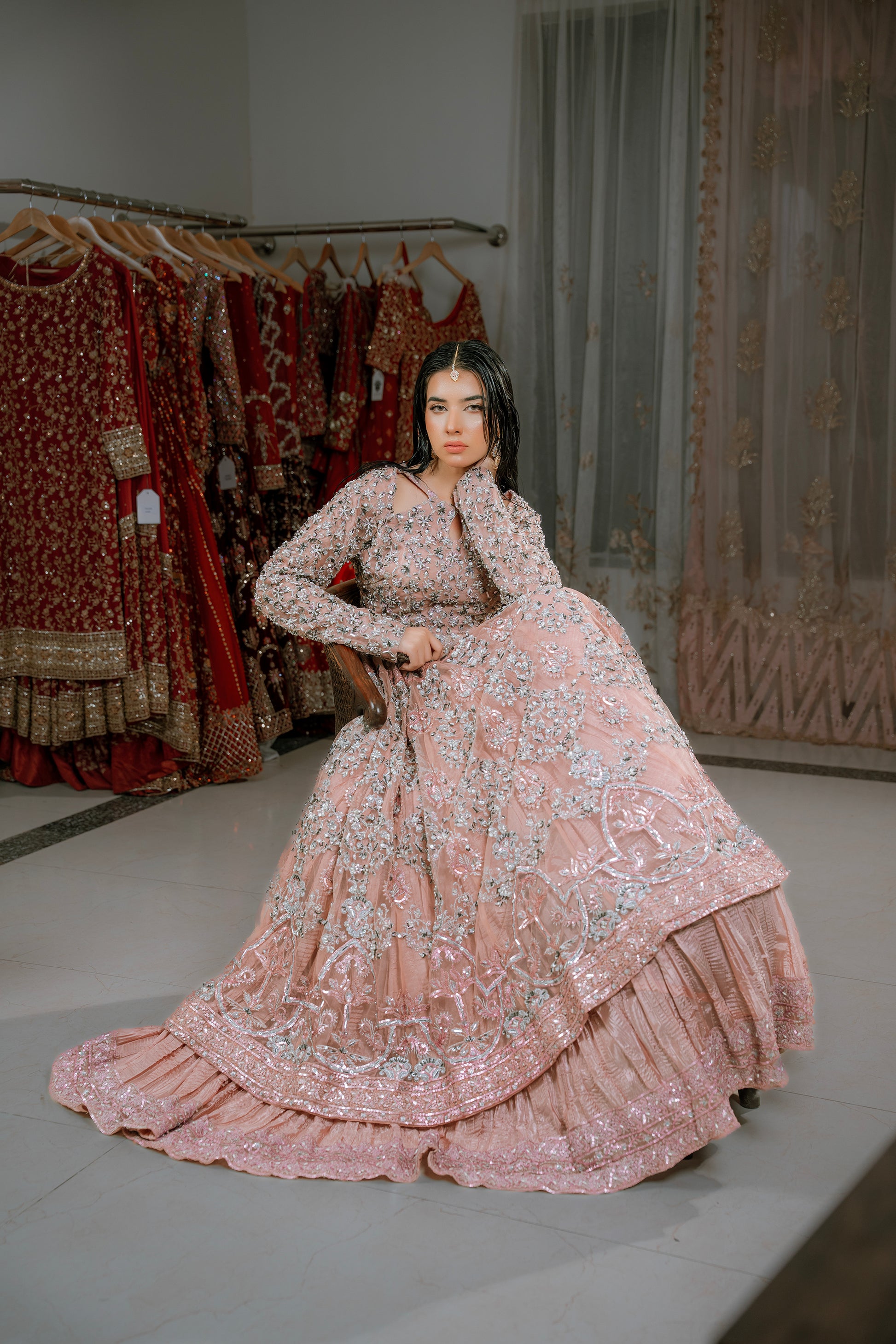 The flowy silhouette creates a graceful, feminine look, while the gown is perfectly paired with a crushed silk lehnga that adds texture and richness to the overall design. Soft, romantic, and effortlessly sophisticated, this outfit is an ideal choice for weddings, receptions, or special occasions where you want to make a lasting impression.