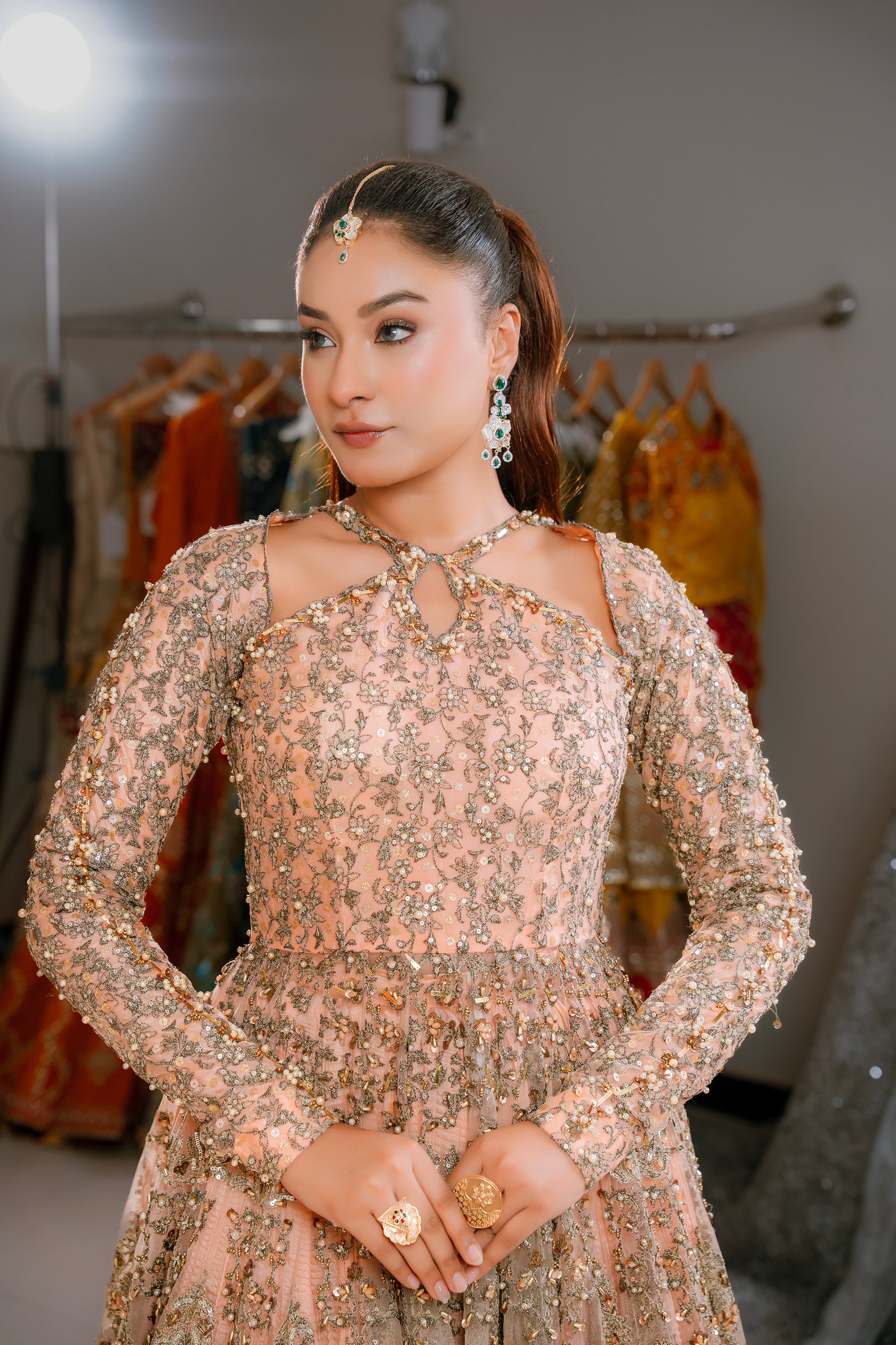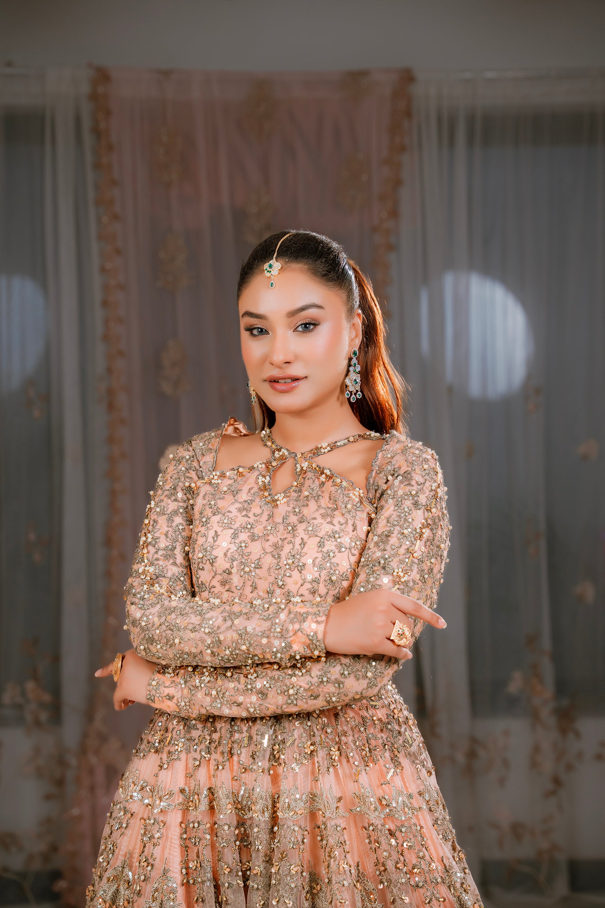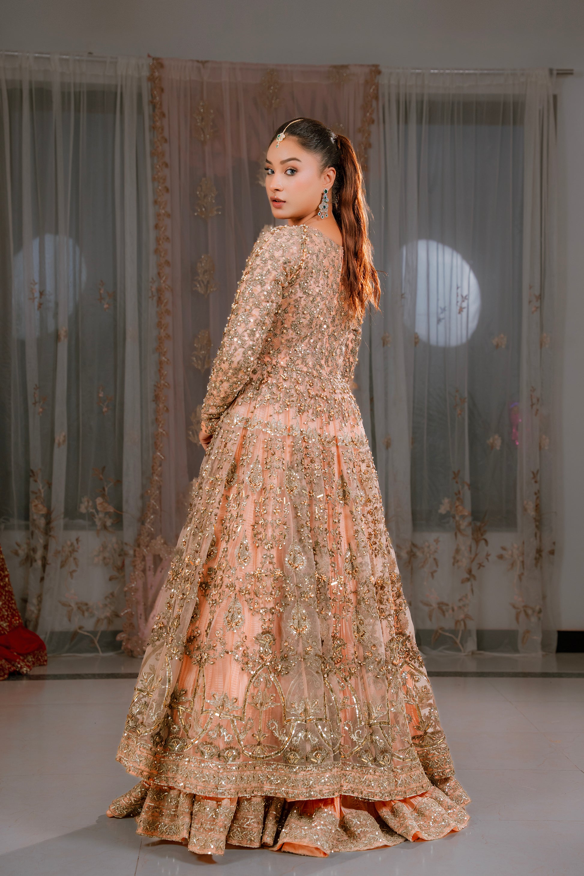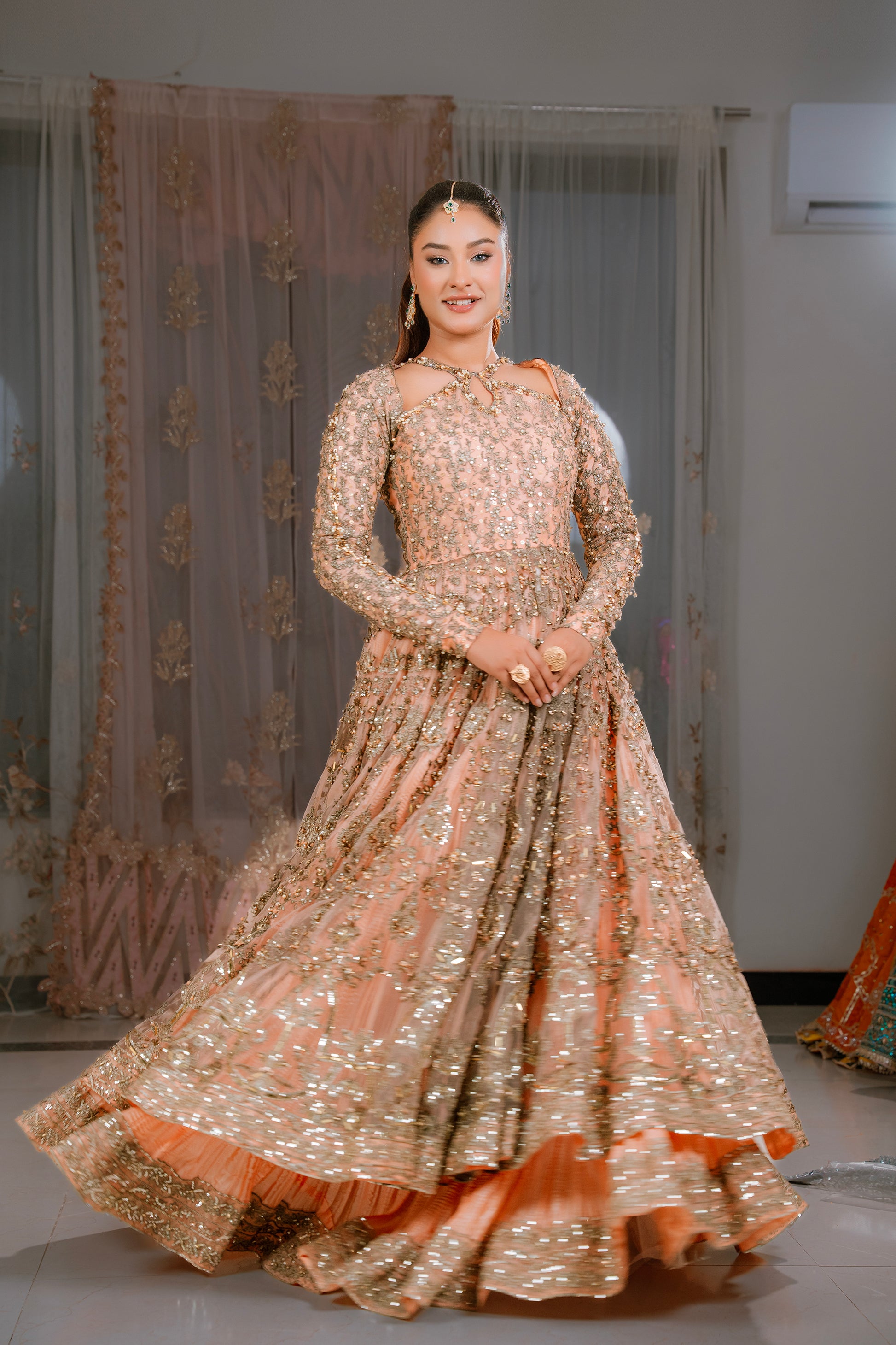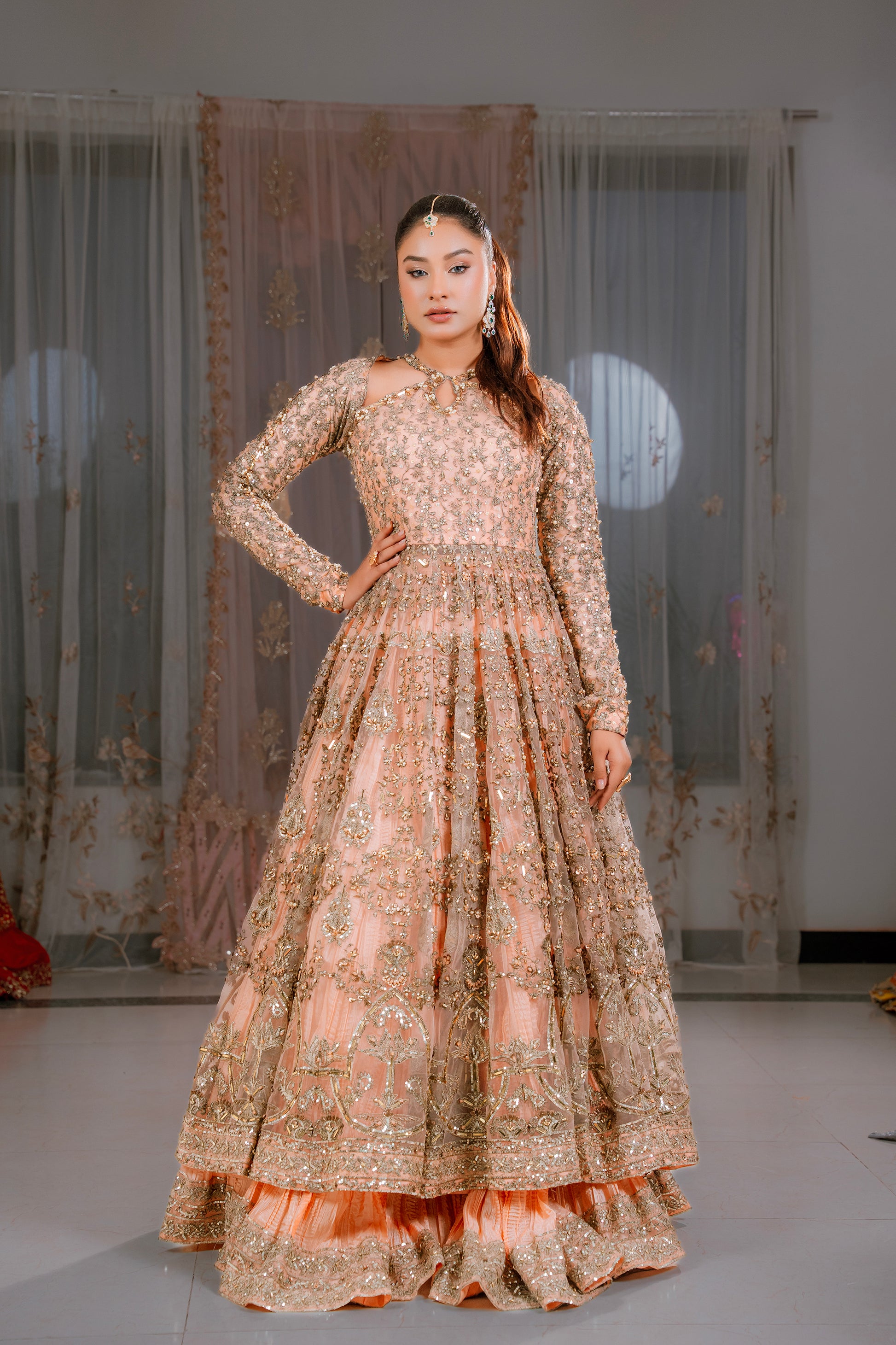 Step into timeless elegance with this stunning peach flared gown crafted from delicate net fabric. The gown features a heavily handcrafted bodice, intricately adorned with fine embroidery and embellishments that bring a luxurious, artisanal touch to the ensemble.