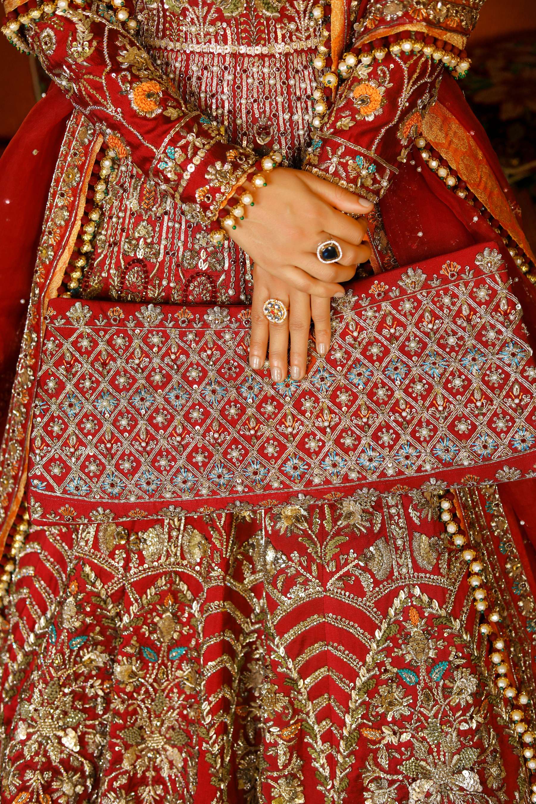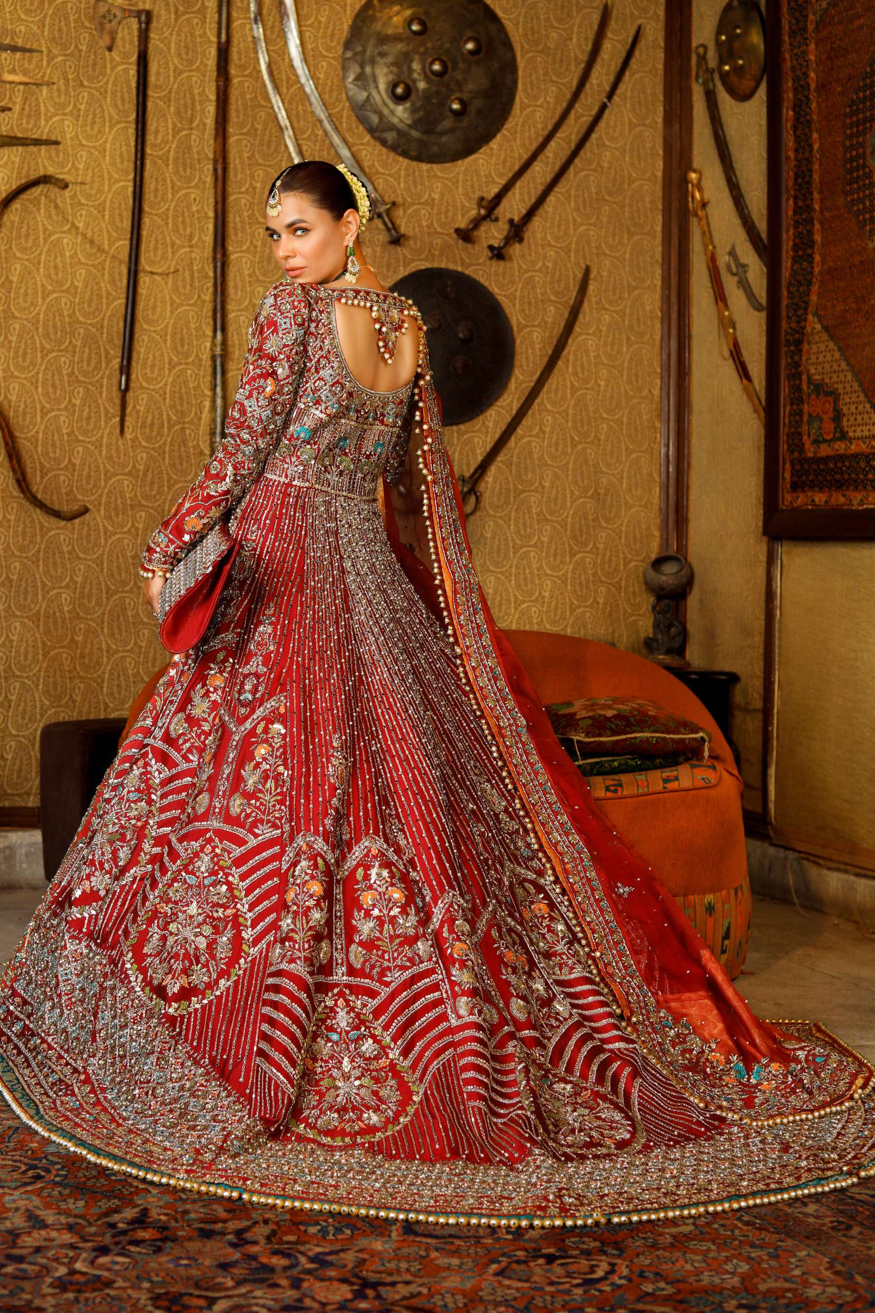 This maroon pure tissue silk pishwas with pannels amalgamated with glit ada work of naqshi,dabka, sequins,pearls,crystals and resham.it comes with organza dupatta of 4.5 yard with wide border deeply finished with gold ada work and spray of two different motifs. It comes along with beautiful embellished clutch and velvety matelic hangings on the hem